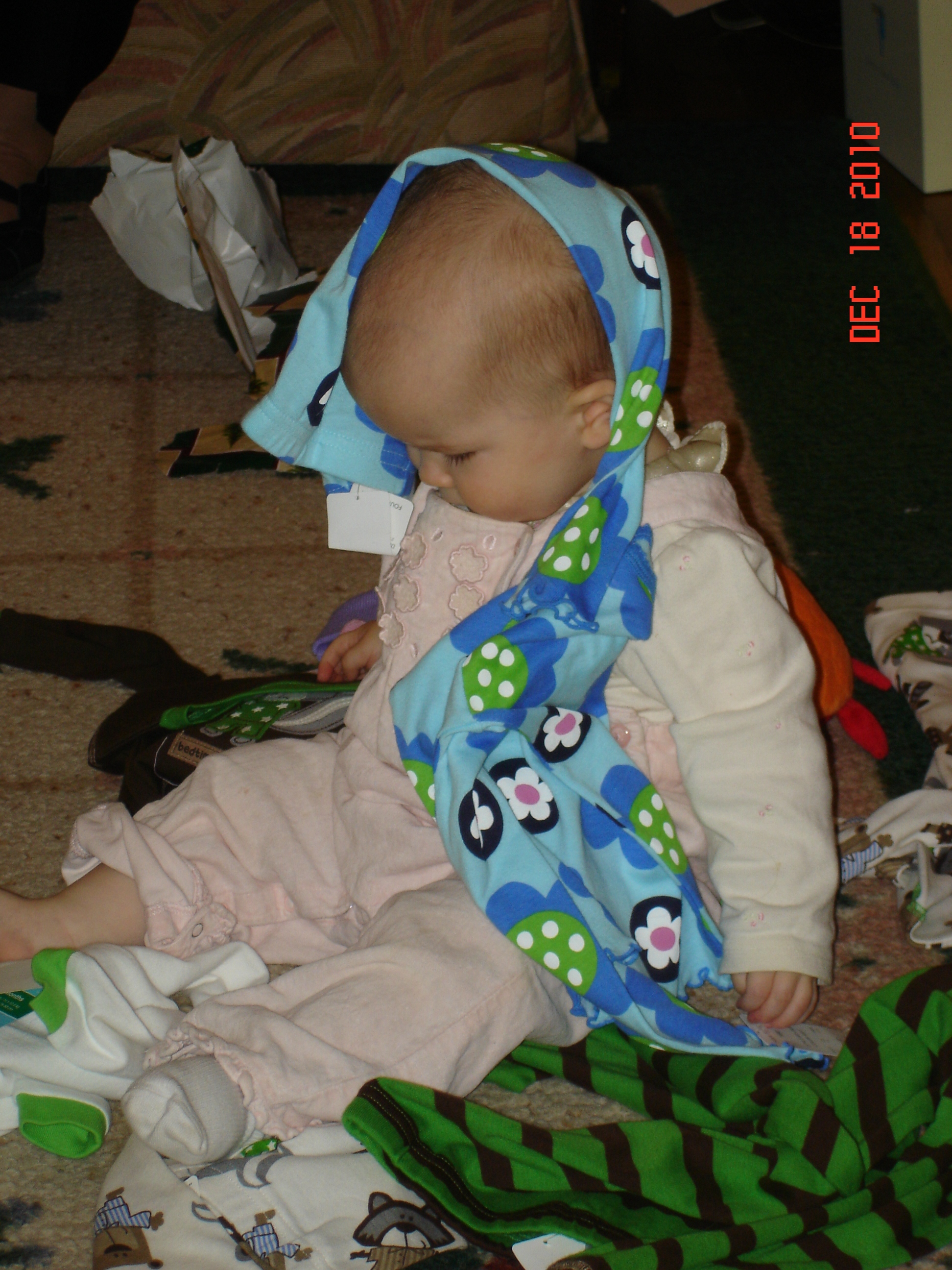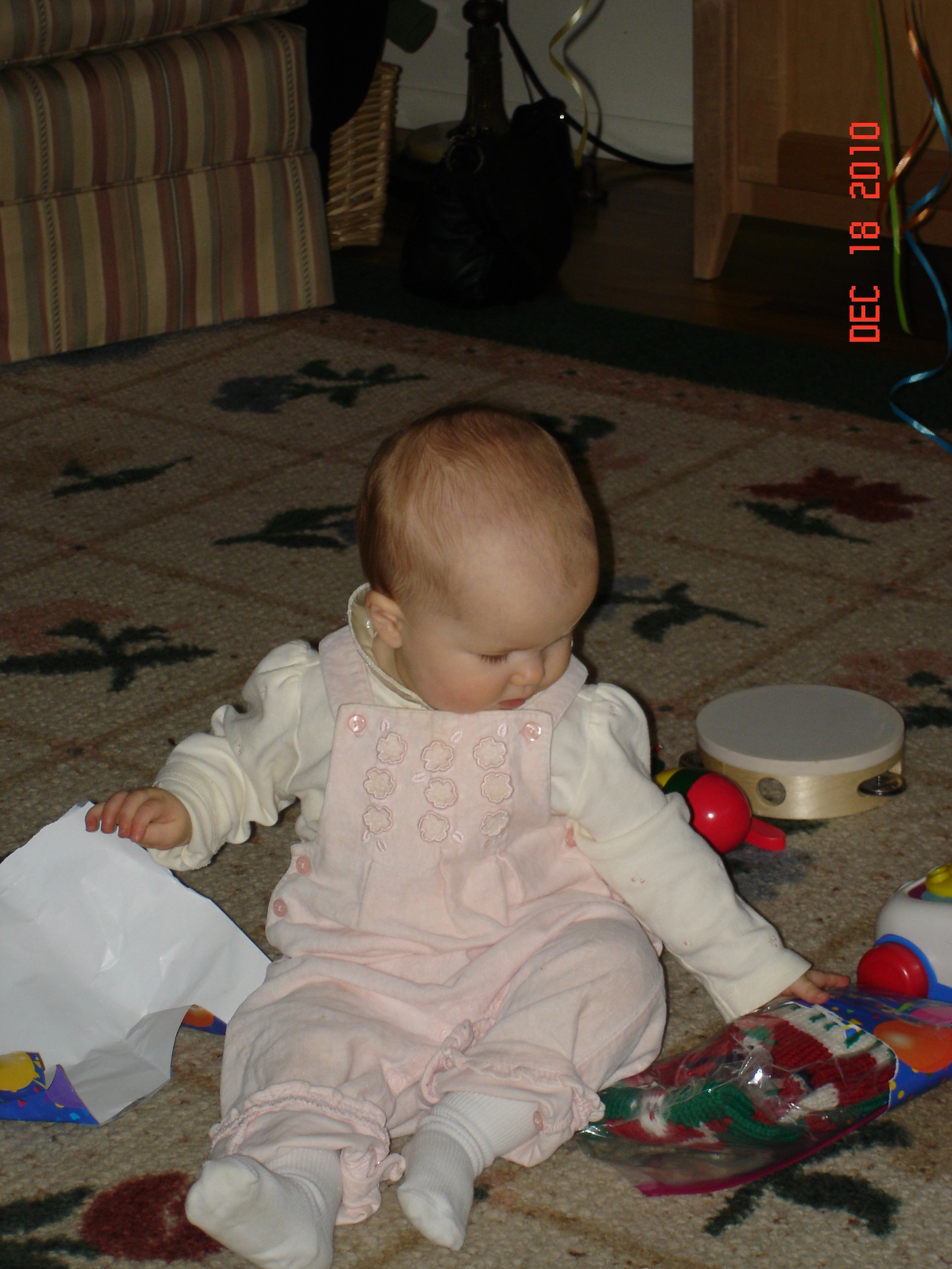 She is getting the knack of opening presents! Note the Christmas stocking completed by G. just in time!