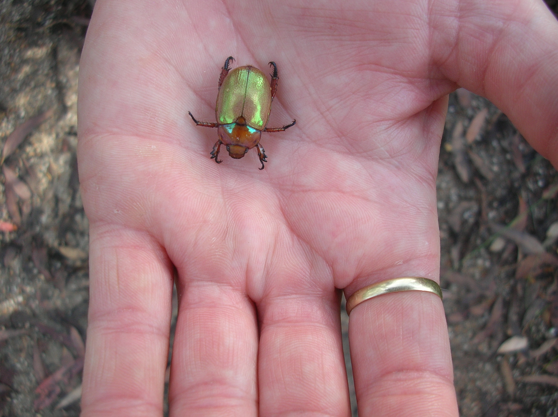 We found this beaut on a trail in Giraween Nat'l Park when we were in Australia (a Scarabid, I think). Cold in the morning, they were bombing around like bumblebees later in the day. (Thanks for the JBS Haldane reference Rusty!)