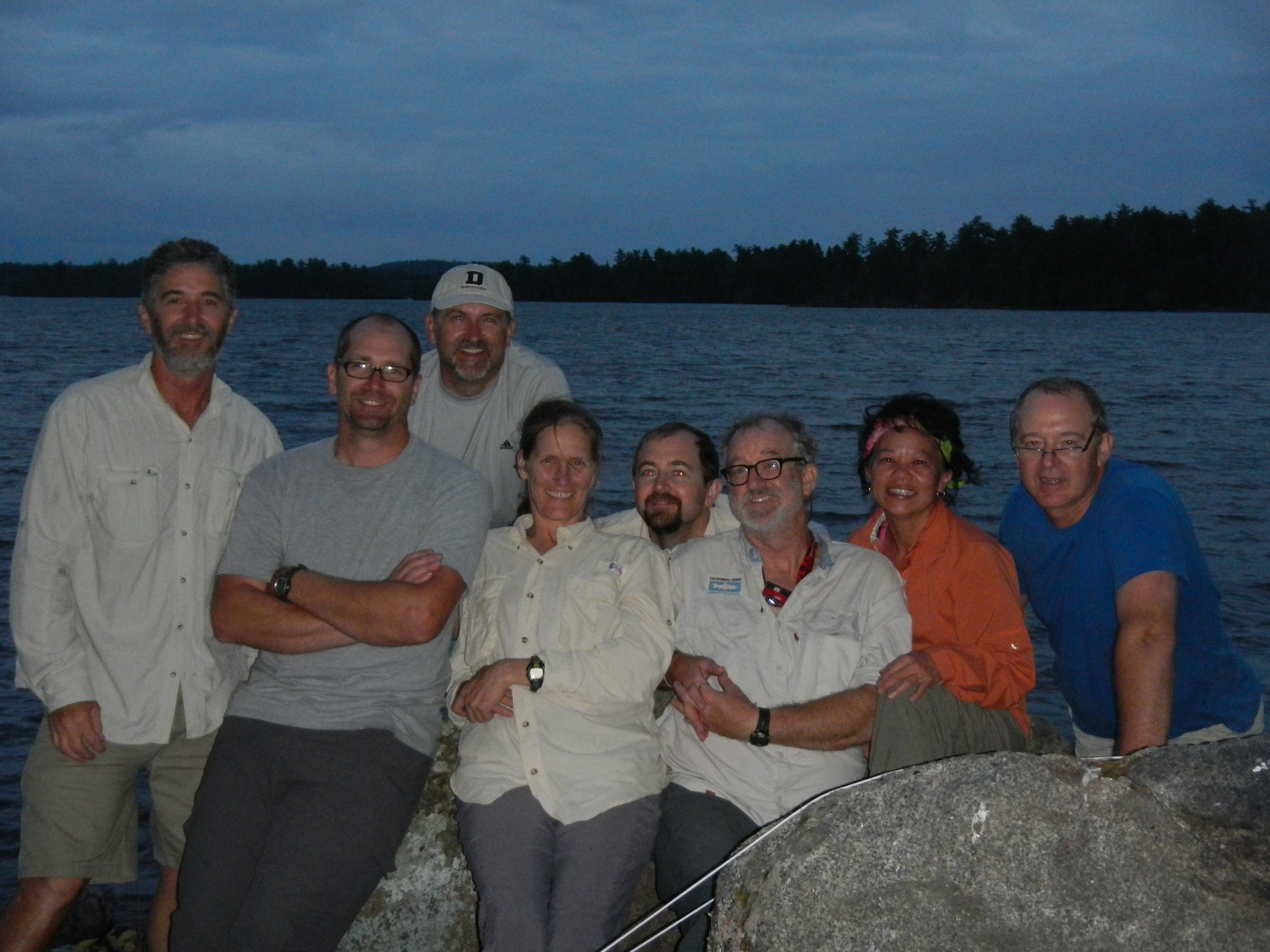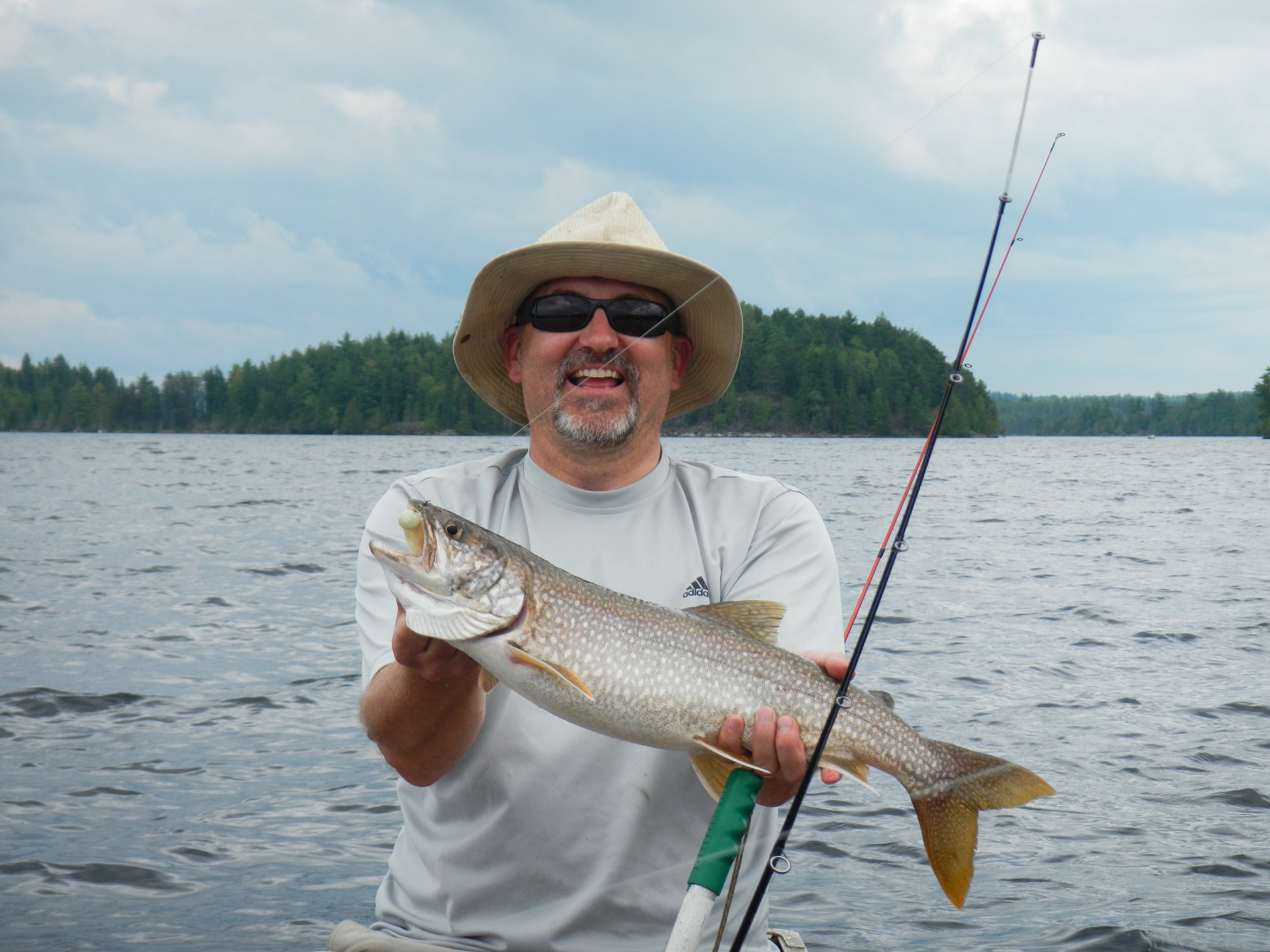 After laying awake most of the night listening to Labatt-laden losers we were ready to get out quickly, but first things first. While things were getting packed up Chris took care of breakfast, whipping up an amazing skillet full of scrambled eggs and sausage that really set us up for the day. We got going to Dave and Pat's, and started ferrying people and gear to Dogpaw Lake where there was a boat ramp. This area is on one of the reservations so we were pretty conscious of trying not to get in the way of anybody, which was difficult when about 7 boats rocked up with a bunch of guys from Connecticut or something who were all going out to one of the camps on the lake for a fishing trip. This probably delayed us for at least half an hour while they got everything loaded, but we were able to use the time will by posing for multiple group shots in the expedition T-shirts. We finally got into the canoes and off, headed for Salvation Camp. The Paddling was pretty easy, there was a bit of a breeze and I’m sure that at the time we thought it was a bit of a pain, but what did we know at that stage of the trip! I got a bass on my first cast, using a daredevil. Nice start to the trip. We got to a narrows where the lake flowed through a channel; this was our planned lunch spot. Obviously people had been doing this for centuries since there were plenty of oaks there suggesting native Americans and traders had spent time there. There were some bushes but no berries, too late in the season I guess, which was a little disappointing since I really love berries. The rocks were slippery getting out and despite (or maybe because of) numerous warnings from Chris Ada slipped and went down right on her butt. No harm done. I guess it was good to get the first fall out of the way…..Once we got thru the passage we got out onto a nice bit stretch of water, and the bolt on sounder I had bought in Salt lake indicated fish near the bottom at about 85 ft and up into the water column to about 45 ft. Actually there were a heap of fish there, and some really big signals on the sounder. We started jigging, I used one of the spoons I had made, Dave had a big (giant) luminescent squid thing that was surely not intended for lake fishing. I thought it was pretty ugly but it got to the bottom which was important, I guess, because after a bout 15 min. Dave hooked into a fish, which turned out to be a pretty nice little (did you notice how I said little Dave?) lake trout around 4lb (27inch). We tried a bit longer without success so kept paddling, picking up a couple more bass on the way, but they all got released. The sounder was a bit of a problem at first since it wobbled a lot, as Jon had found the year before. We discussed this at lunch and thought about various kinds of vanes we might make to stabilize it. Something Jon said about turbulence made me remember that some of the oceanographic cables I have seen are furry to stop exactly this type of thing. So I tied on bunches of grass. It looked like crap but worked a treat. The sight of Salvation Camp was very welcome after 18km and it was a great camp with a great dinner of skirt steak that Jon and Carrie cooked. Dave cooked the trout for lunch the next day. Slept really well as the ground was very soft and duffy. Dark though under the trees. A big front came thru just before dawn with winds blowing about 25 knots so the canoeing promised to be “interesting”.