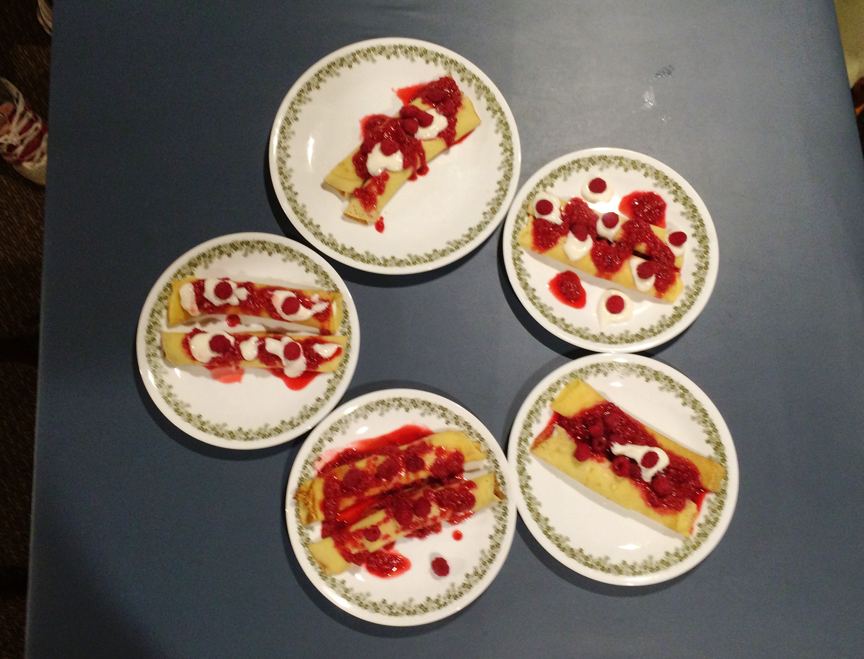 Their cabin is located in a beautiful area near a couple small lakes. We spent our time hunting mushrooms and found some really nice chanterelles but it had been pretty dry. We did find a nice bunch of what looked like Pleurotis but it was not the usual species and so we passed on them. We also rode bikes and checked out a log home that was being raised nearby. Deb fed us really well (pancakes, pot roast) and we were able to construct some crepes topped with raspberry sauce from the berries we picked around the cabin and around Shiocton.