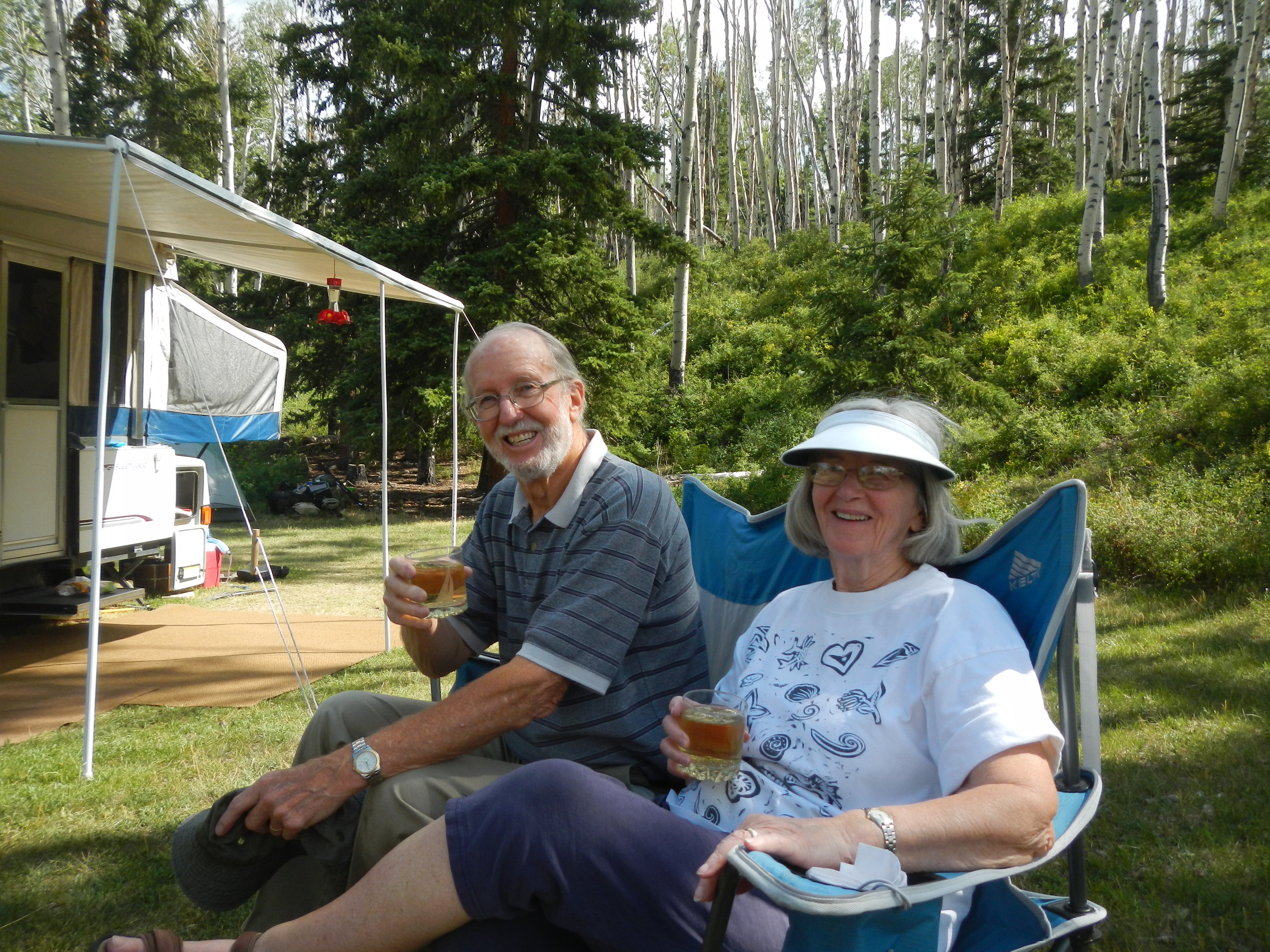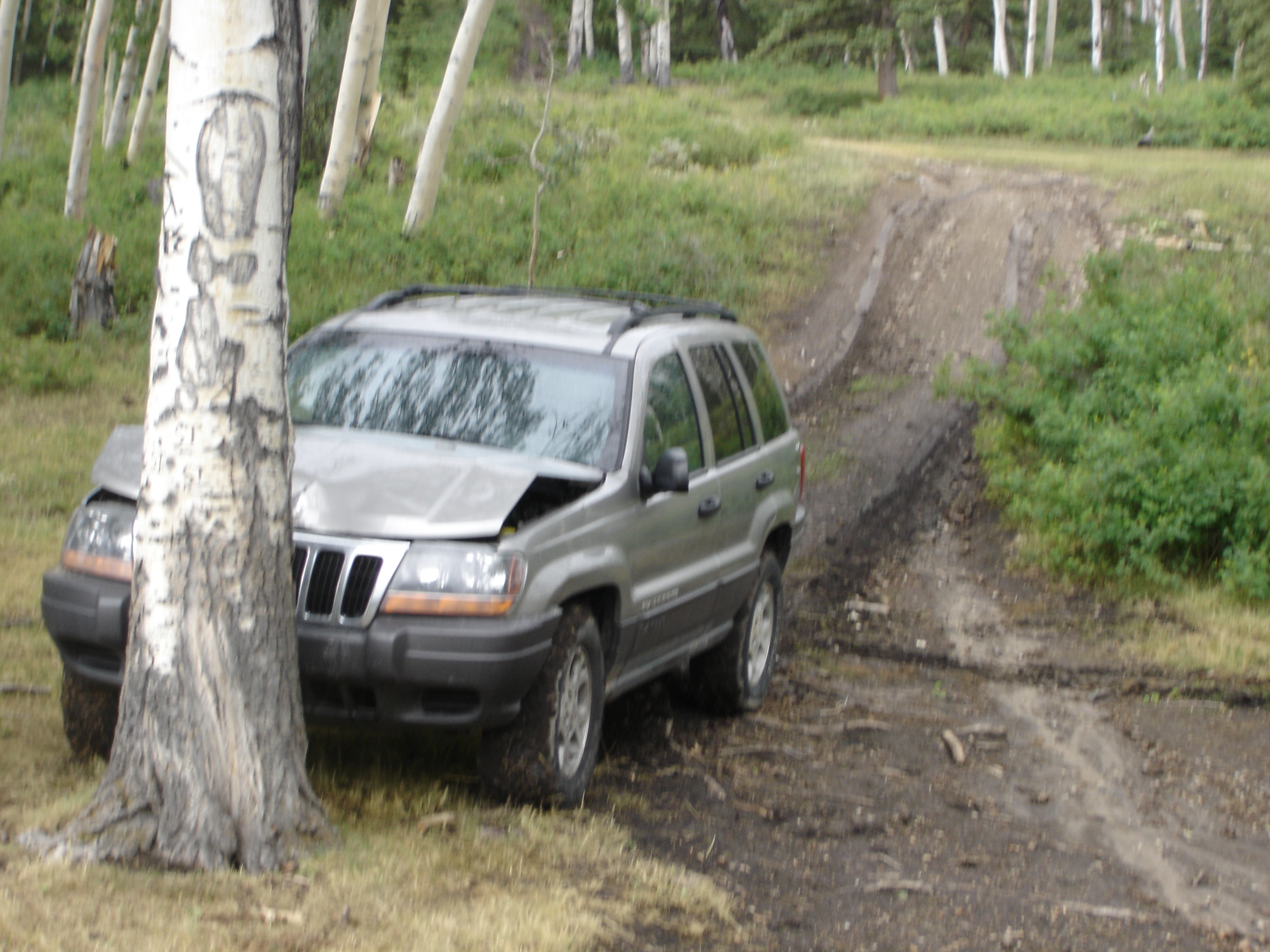 We went to our usual spot above Ferron Sunday, the 27th, It was monsoon season and lots of thunder showers. On Tuesday we thought we would go fishing and slid down the dirt access track into a tree, head on. No airbag deployed (not sure we even had them on the 2001 jeep). Judy stressed her sternum against the seat belt -I felt like I pushed the steering wheel into the dash, but didn't. We called State Farm and they hauled the jeep off to Price for estimate of damage (and maybe repair). We called David and he and Laura came down on Thursday to take us back to SLC. They stayed two nights, which was good - Dave hadn't been with us in the camper before, and Laura's Dad had a camper when they were growing up. They got out fishing and we had a great fish dinner. The Jeep has now been totaled by St. Farm, and we'll get a check for about what we could have sold it for on the street. We had been looking for a newer used one for the last month, so now we'll accelerate the search!