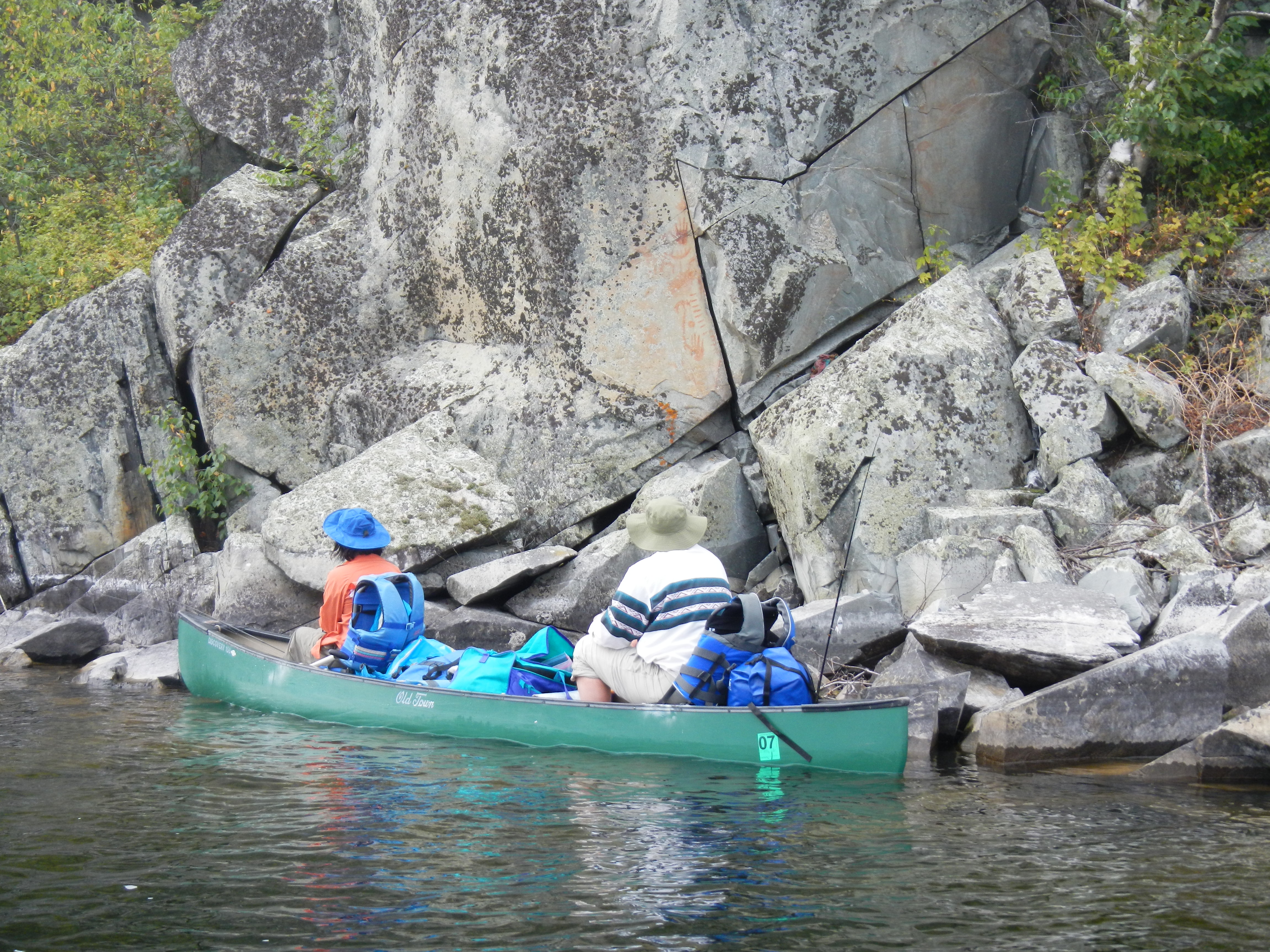 Steven Lake was another shallow turbid one, and we got a couple of small pike trolling around the shore before crossing the lake. John and Carrie were leading the way and stopped on the far shore at the base of a bluff that featured a lot of lichen covered boulders and outcrops as well that poke through some scrubby oak and blackberry vegetation. They had stopped having spotted some impressive rock paintings which we all stopped to have a look at. Some interesting animals were featured, including buffalo, as well as a bunch of hash marks. We couldn’t help speculating on what they might mean. The area was still in use with a number of modern items left at the site presumably by the same people who did the rock paintings so long ago. Despite the modern nature of the items and our closer proximity in time we didn’t have any better idea of what these meant.