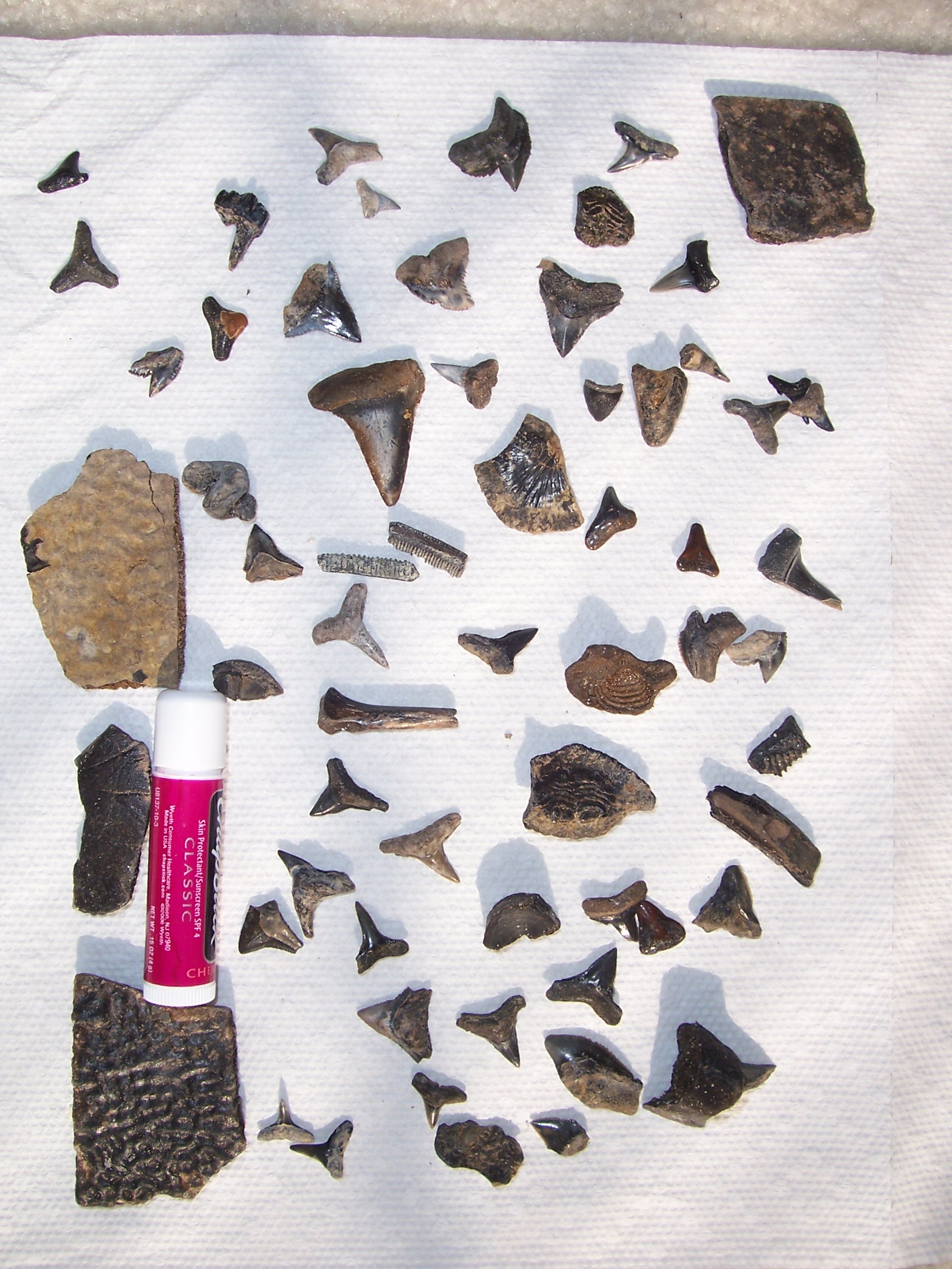 Andy and i went on a fossil trip into south central Florida on a recent spring break trip there. here's a shot of the ones that we found. Next time we'll be looking for a 6 inch long Megalodon tooth. Also attached is a picture of the gator that we spotted next to the road. It looked to be about 7-8 ft long. Pretty tame though as we were almost able to pet it before it took off.