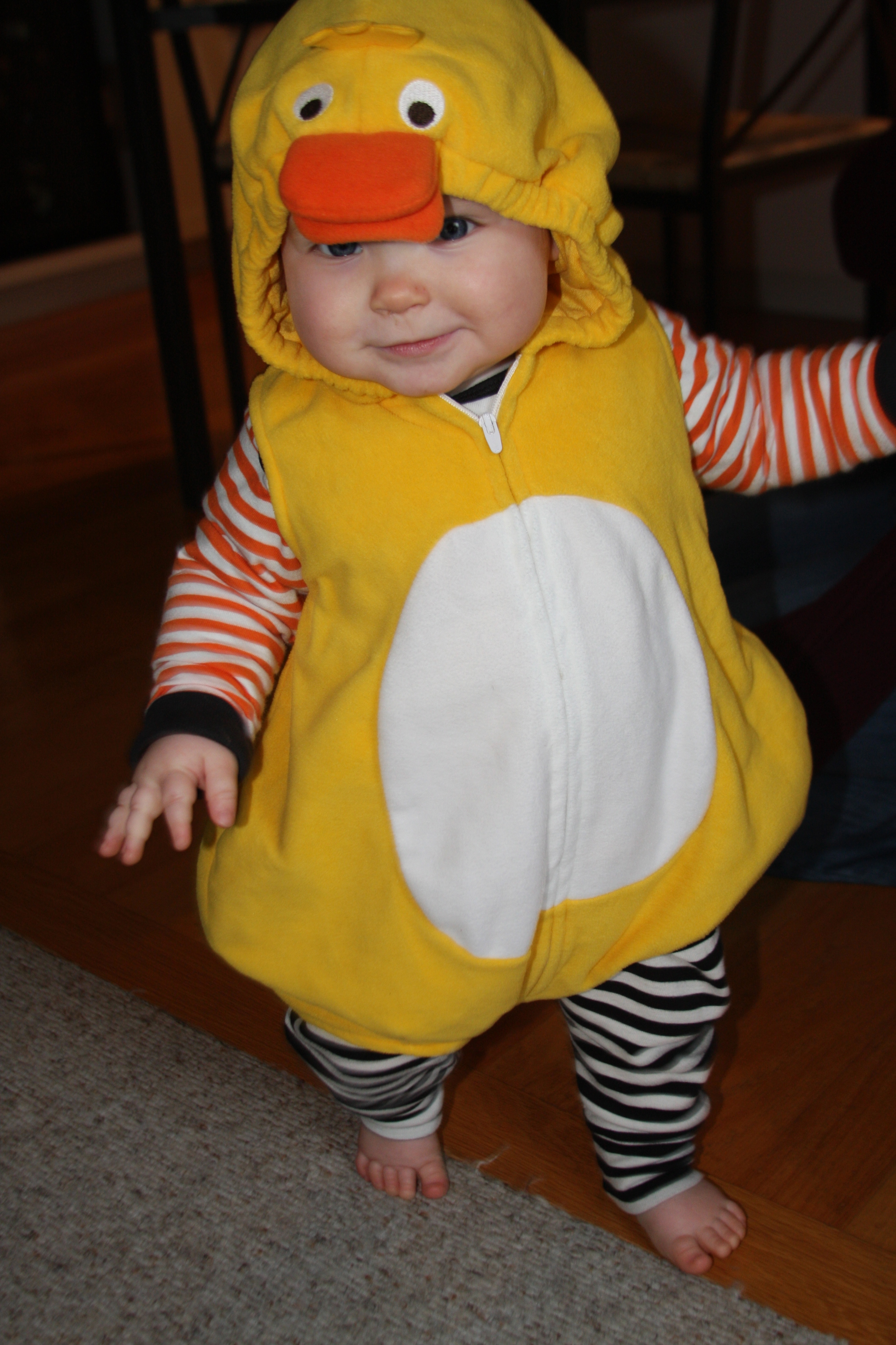Mathilda dressed up as a duck. She is walking around pretty well now and is looking forward to going door to door next year.