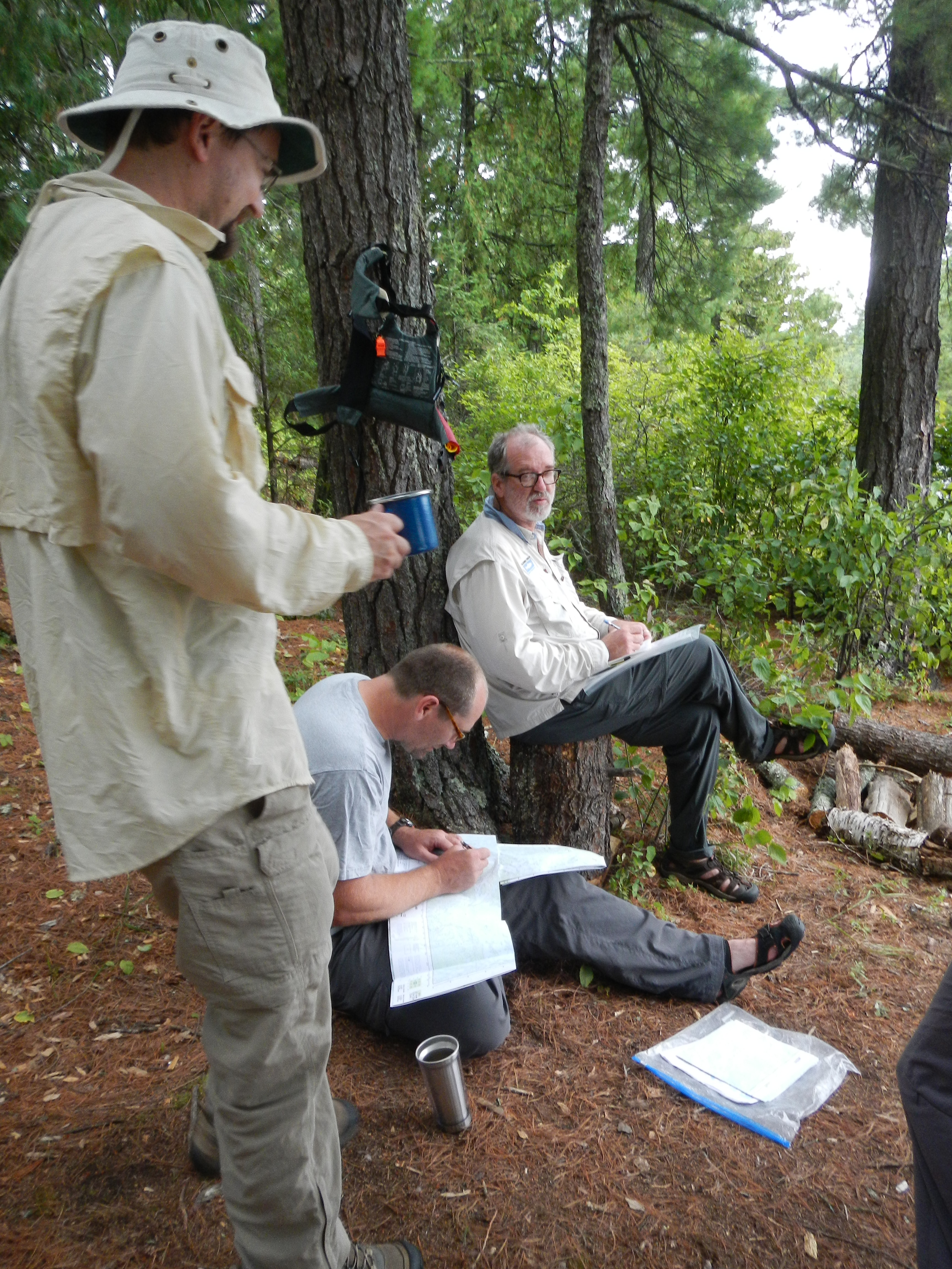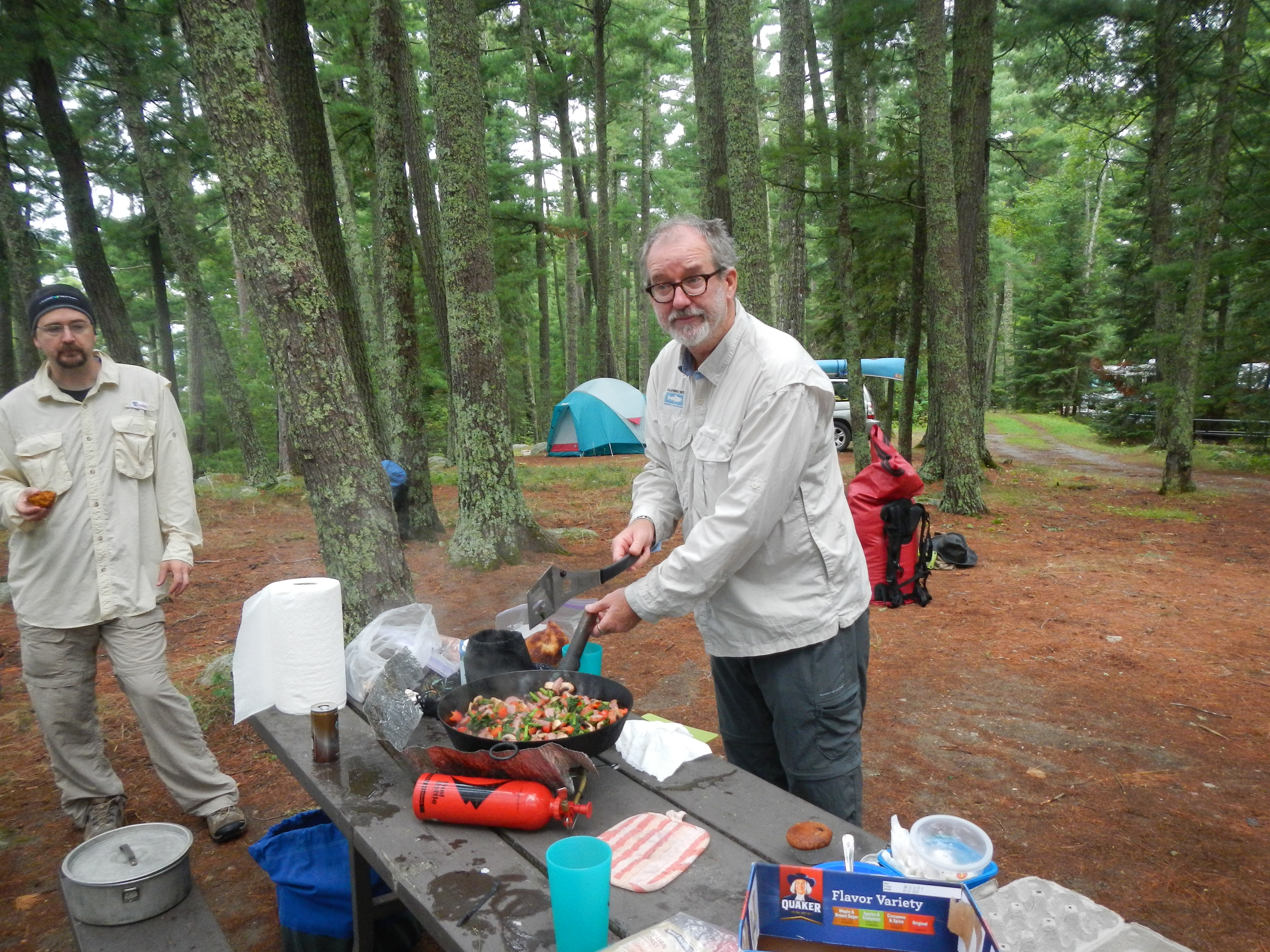 After laying awake most of the night listening to Labatt-laden losers we were ready to get out quickly, but first things first. While things were getting packed up Chris took care of breakfast, whipping up an amazing skillet full of scrambled eggs and sausage that really set us up for the day. We got going to Dave and Pat's, and started ferrying people and gear to Dogpaw Lake where there was a boat ramp. This area is on one of the reservations so we were pretty conscious of trying not to get in the way of anybody, which was difficult when about 7 boats rocked up with a bunch of guys from Connecticut or something who were all going out to one of the camps on the lake for a fishing trip. This probably delayed us for at least half an hour while they got everything loaded, but we were able to use the time will by posing for multiple group shots in the expedition T-shirts. We finally got into the canoes and off, headed for Salvation Camp. The Paddling was pretty easy, there was a bit of a breeze and I’m sure that at the time we thought it was a bit of a pain, but what did we know at that stage of the trip! I got a bass on my first cast, using a daredevil. Nice start to the trip. We got to a narrows where the lake flowed through a channel; this was our planned lunch spot. Obviously people had been doing this for centuries since there were plenty of oaks there suggesting native Americans and traders had spent time there. There were some bushes but no berries, too late in the season I guess, which was a little disappointing since I really love berries. The rocks were slippery getting out and despite (or maybe because of) numerous warnings from Chris Ada slipped and went down right on her butt. No harm done. I guess it was good to get the first fall out of the way…..Once we got thru the passage we got out onto a nice bit stretch of water, and the bolt on sounder I had bought in Salt lake indicated fish near the bottom at about 85 ft and up into the water column to about 45 ft. Actually there were a heap of fish there, and some really big signals on the sounder. We started jigging, I used one of the spoons I had made, Dave had a big (giant) luminescent squid thing that was surely not intended for lake fishing. I thought it was pretty ugly but it got to the bottom which was important, I guess, because after a bout 15 min. Dave hooked into a fish, which turned out to be a pretty nice little (did you notice how I said little Dave?) lake trout around 4lb (27inch). We tried a bit longer without success so kept paddling, picking up a couple more bass on the way, but they all got released. The sounder was a bit of a problem at first since it wobbled a lot, as Jon had found the year before. We discussed this at lunch and thought about various kinds of vanes we might make to stabilize it. Something Jon said about turbulence made me remember that some of the oceanographic cables I have seen are furry to stop exactly this type of thing. So I tied on bunches of grass. It looked like crap but worked a treat. The sight of Salvation Camp was very welcome after 18km and it was a great camp with a great dinner of skirt steak that Jon and Carrie cooked. Dave cooked the trout for lunch the next day. Slept really well as the ground was very soft and duffy. Dark though under the trees. A big front came thru just before dawn with winds blowing about 25 knots so the canoeing promised to be “interesting”.