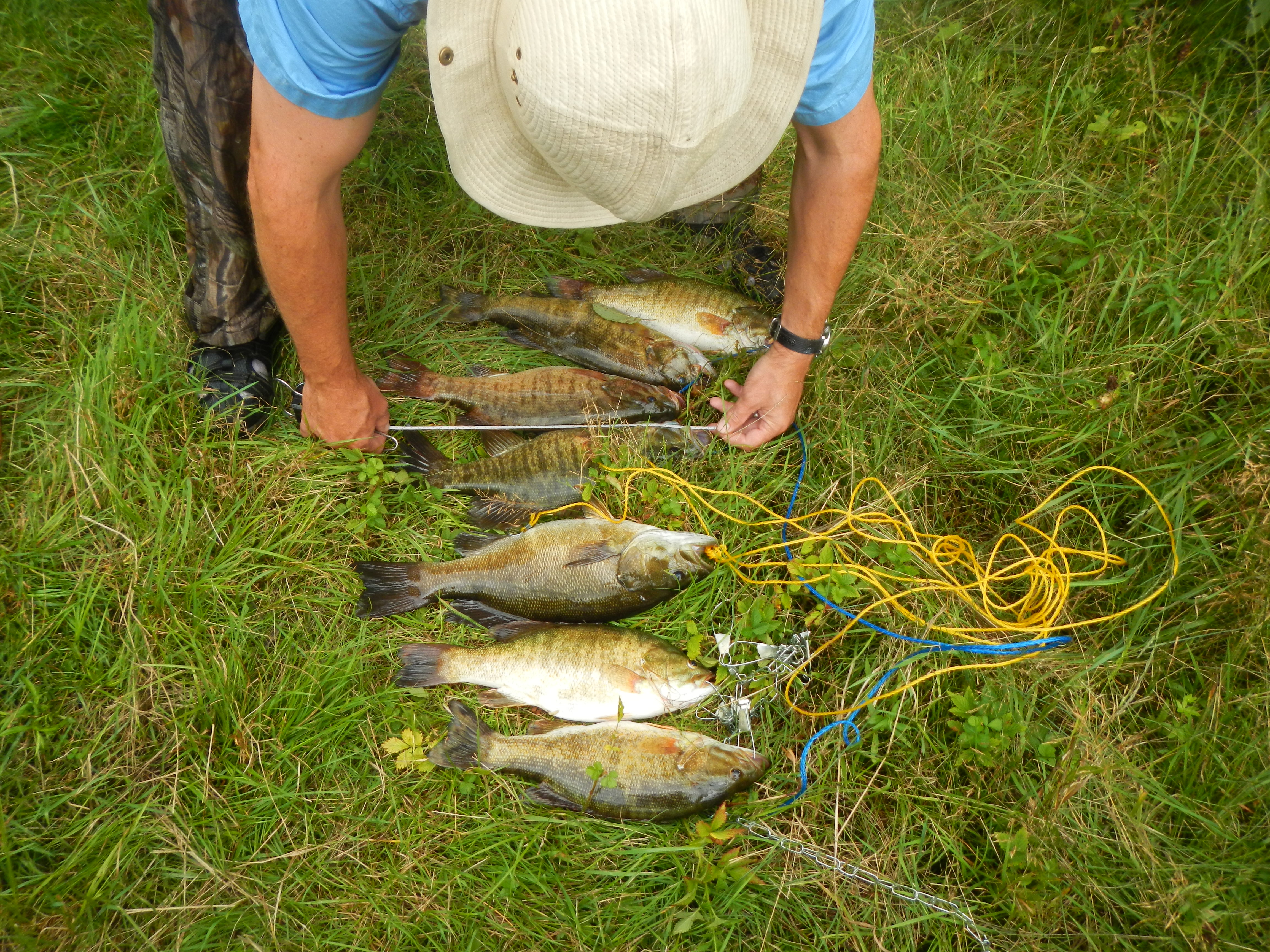 There were quite a few cabins around the put-in on Cameron Lake which was a bit of a contrast to Shingwak in that it was quite shallow and turbid. It did have some Bass in it though, and everyone was getting a few, particularly Dave and Mike. Must have been that lure Mike retrieved. By this time the wind had backed right off, the clouds had gone and it was a great looking day. When we stopped at the end of the lake we had a really nice stringer of good size bass between 1.5 – 2.5 lbs, to the point where Jason and I decided to fillet them there and then rather than carry the extra weight on the portage to Steven Lake, although it was not a big walk. By the time we finished them all the portaging had been done, but by the end of that chore my back was more sore than if I had been carrying the canoes etc. It was worth it though because we needed the bass for dinner.