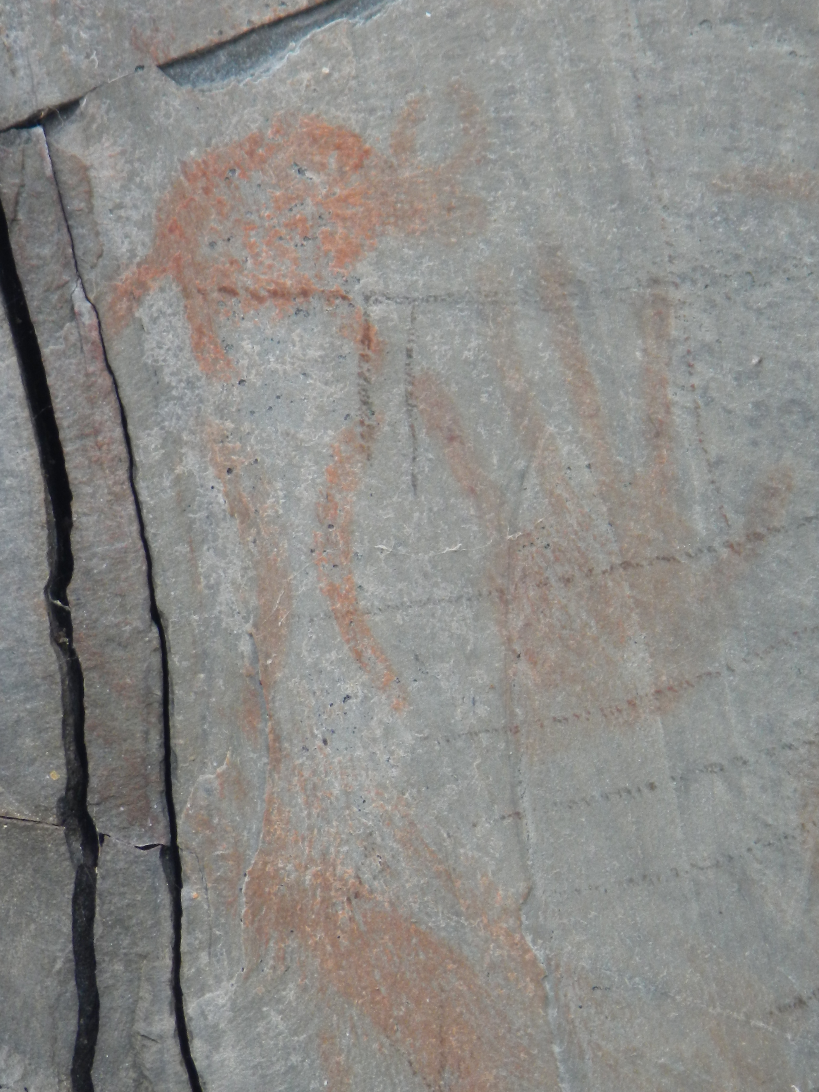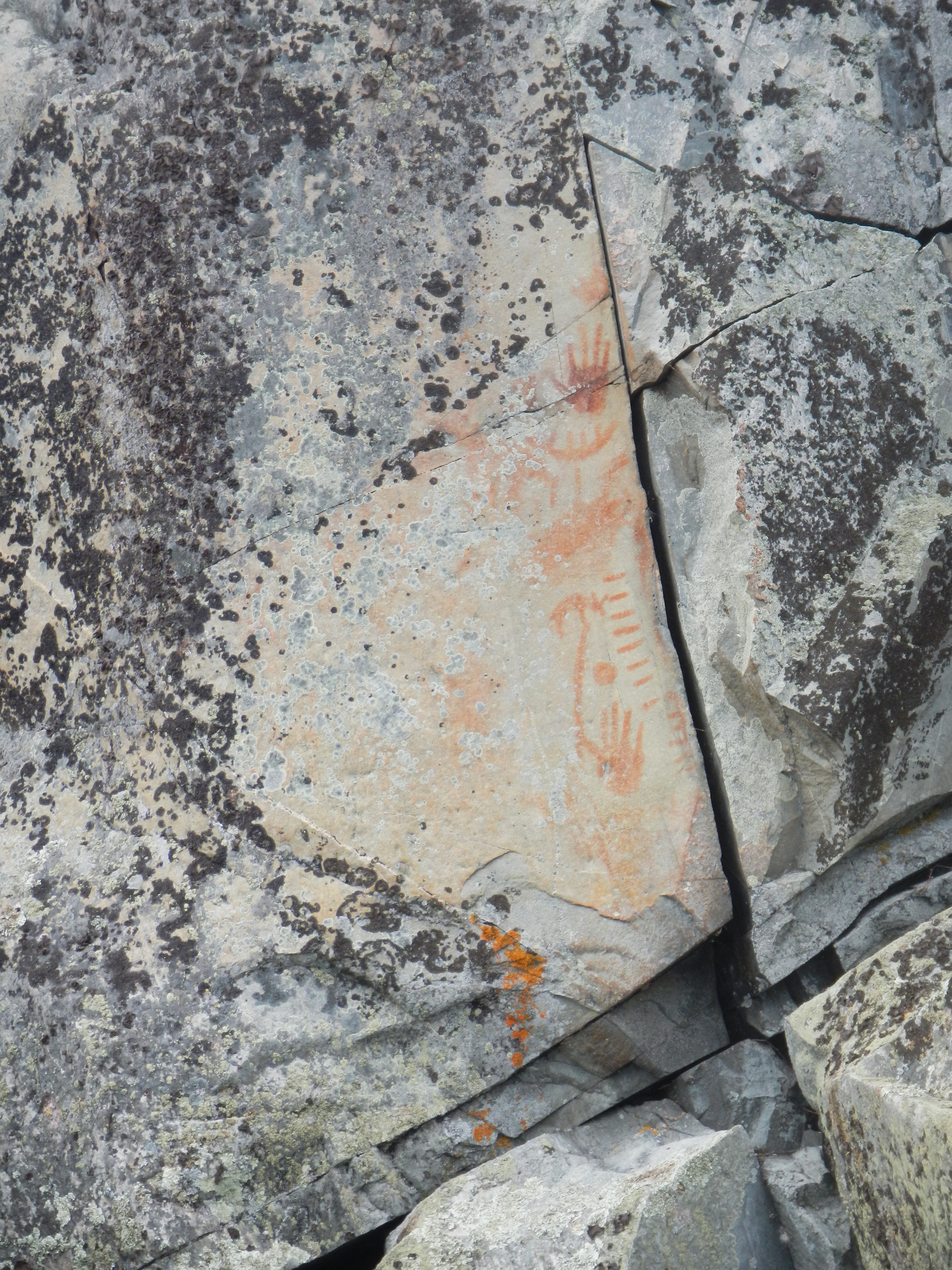 Steven Lake was another shallow turbid one, and we got a couple of small pike trolling around the shore before crossing the lake. John and Carrie were leading the way and stopped on the far shore at the base of a bluff that featured a lot of lichen covered boulders and outcrops as well that poke through some scrubby oak and blackberry vegetation. They had stopped having spotted some impressive rock paintings which we all stopped to have a look at. Some interesting animals were featured, including buffalo, as well as a bunch of hash marks. We couldn’t help speculating on what they might mean. The area was still in use with a number of modern items left at the site presumably by the same people who did the rock paintings so long ago. Despite the modern nature of the items and our closer proximity in time we didn’t have any better idea of what these meant.