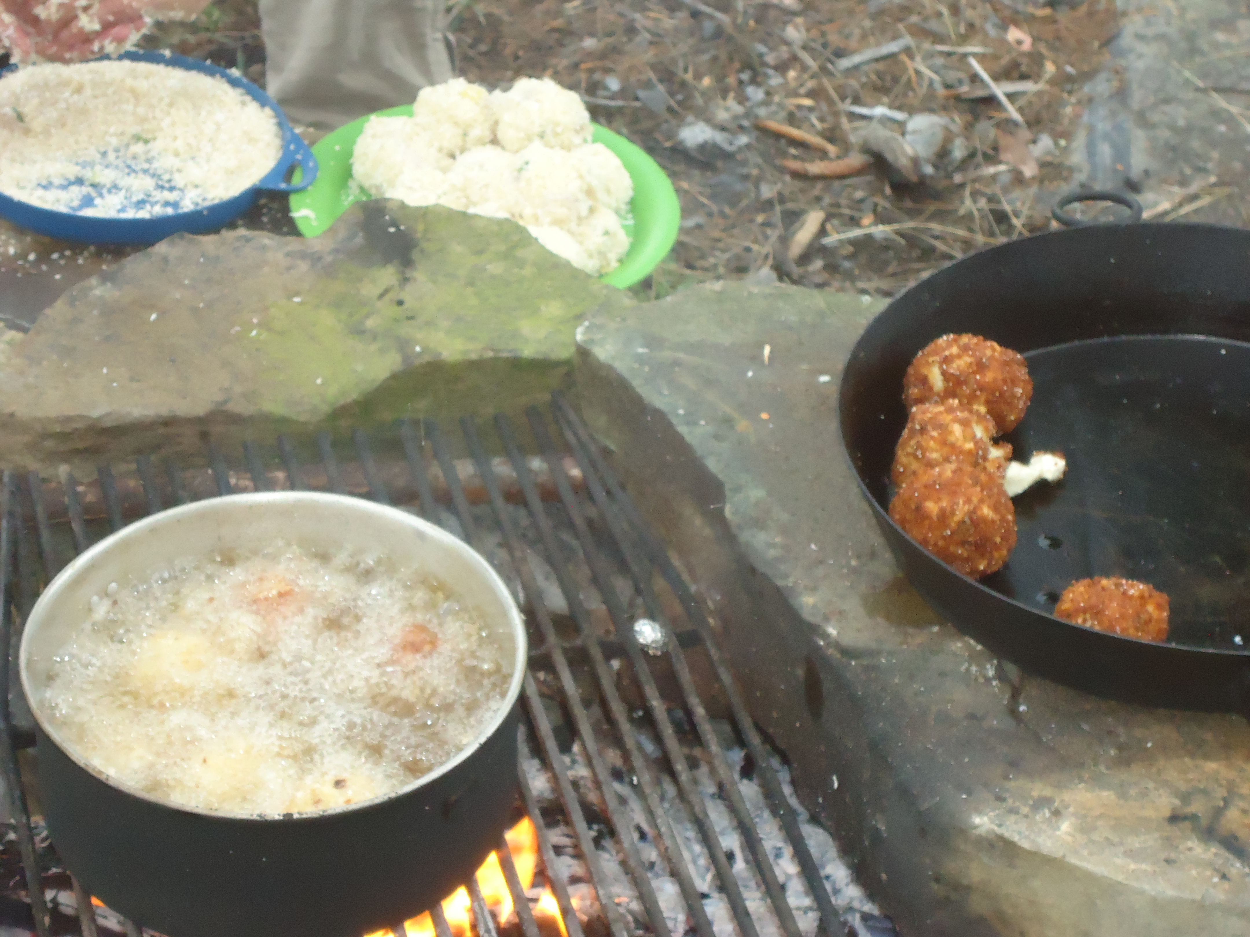 About a km down the shore we found a great campsite at the other end of the bluff on a low lying outcropping area. The vegetation indicated it had also been used as a camp site for a long long time. Mike repaired his Tevas which were de-laminating (awl in a day’s work) while dinner was being prepared. Dinner featured the dutch oven and a bunch of those bass we had caught – deep fried curried fish balls with carrot kofta, green beans on the side. Also an exploding rock that caught Carrie with a bunch of fragments, fortunately no serious harm done. By this time is was really calm and glassy, and there was a really nice sunset.