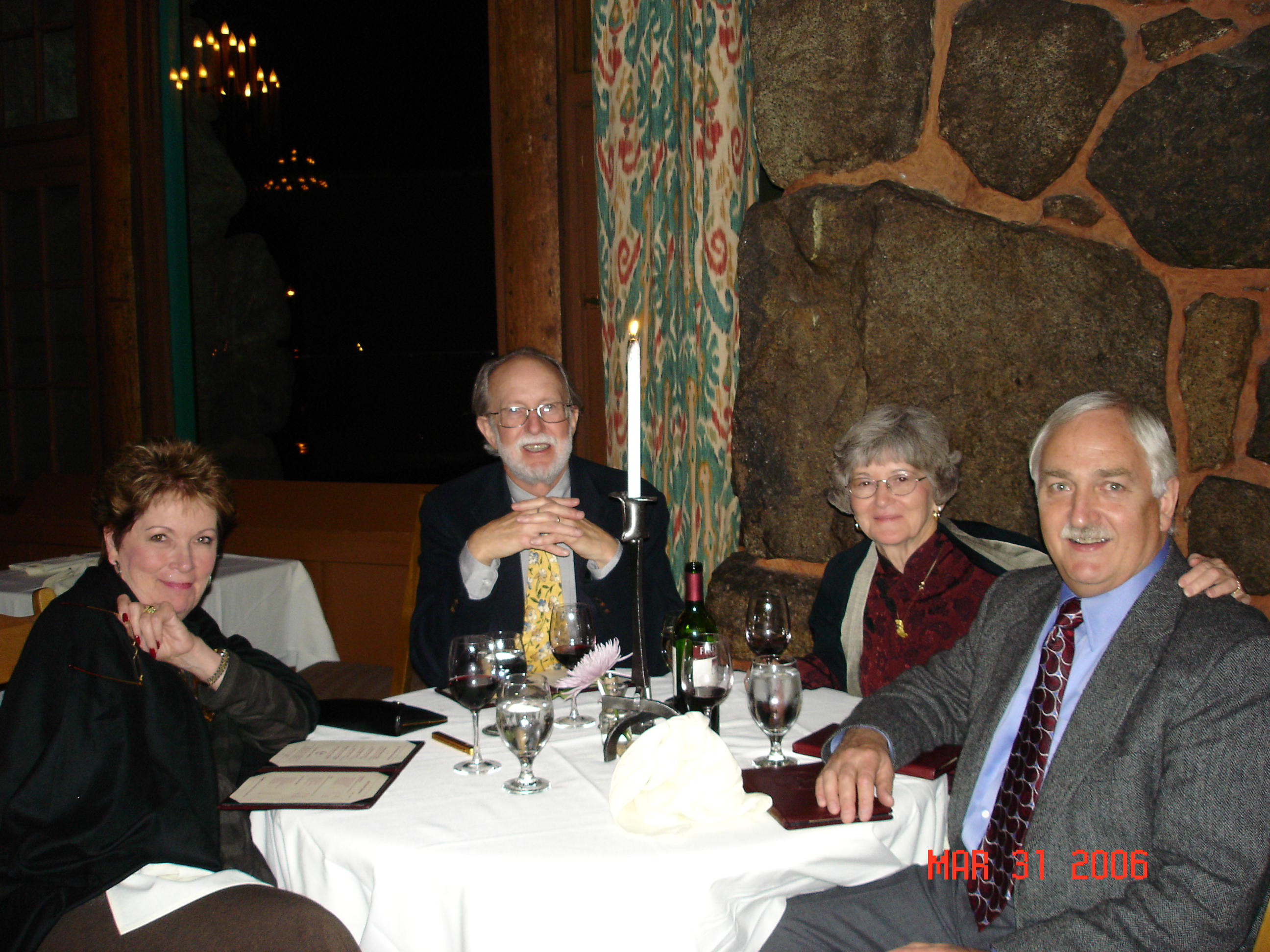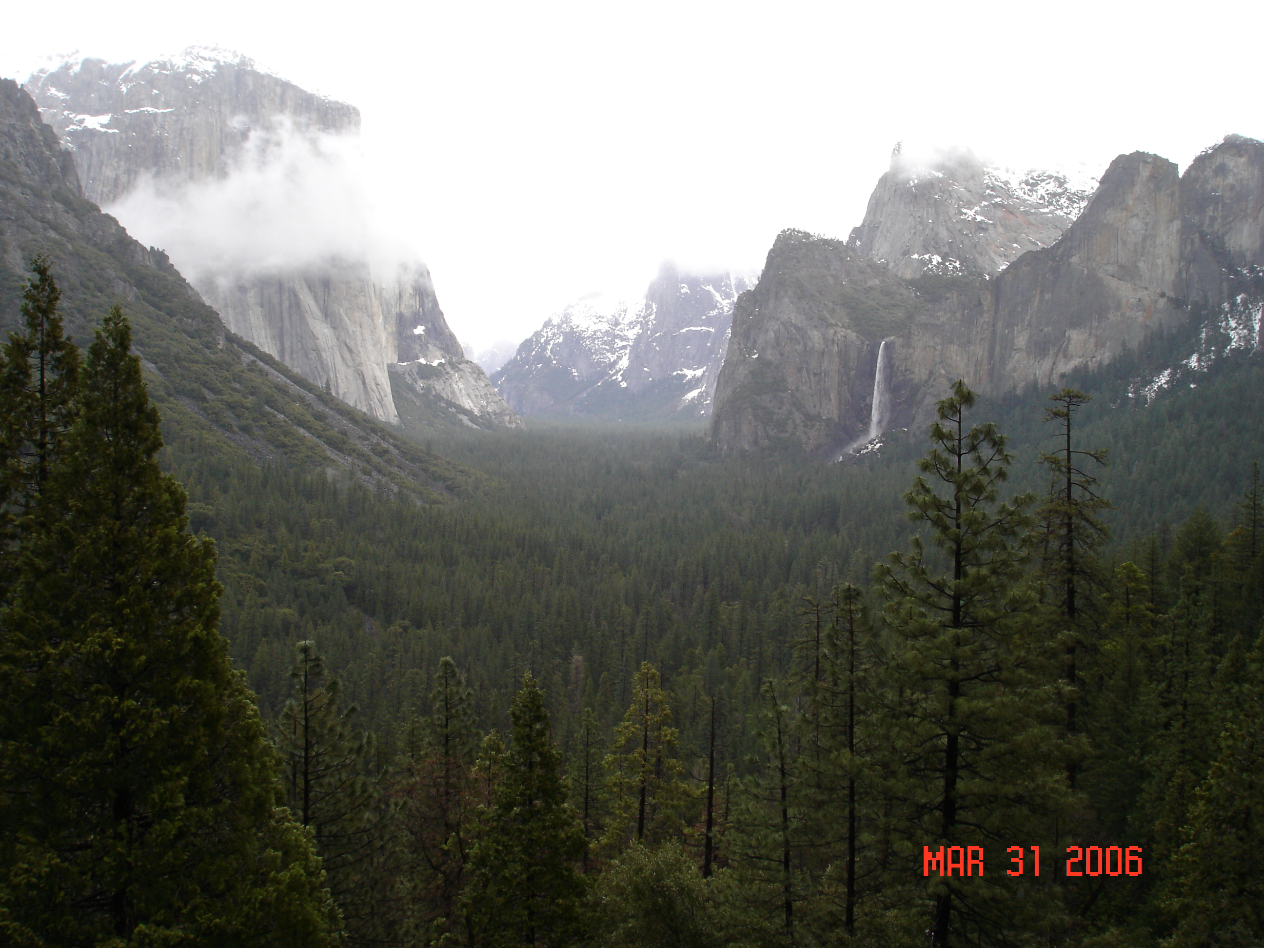 We had a great visit with Mike, then the relatives in Santa Rosa, and then met Mike and Kathy Turbott in San Francisco and headed for Yosemite. It was rainy the first two days but it snowed on Saturday night and was sunny on Sunday. The Hotel was grand, good food and wine, a pleasant old place like the lodges at Zion, Yellowstone, etc. Lots of wood and stone! The valley was as spectacular as ever, moreso because of all the rain and the waterfalls were working their hearts out! And the layered clouds gave everything a strong vertical perspective. Also, there wern't a lot of people around - the best time of year to visit. Here's some pictures.
