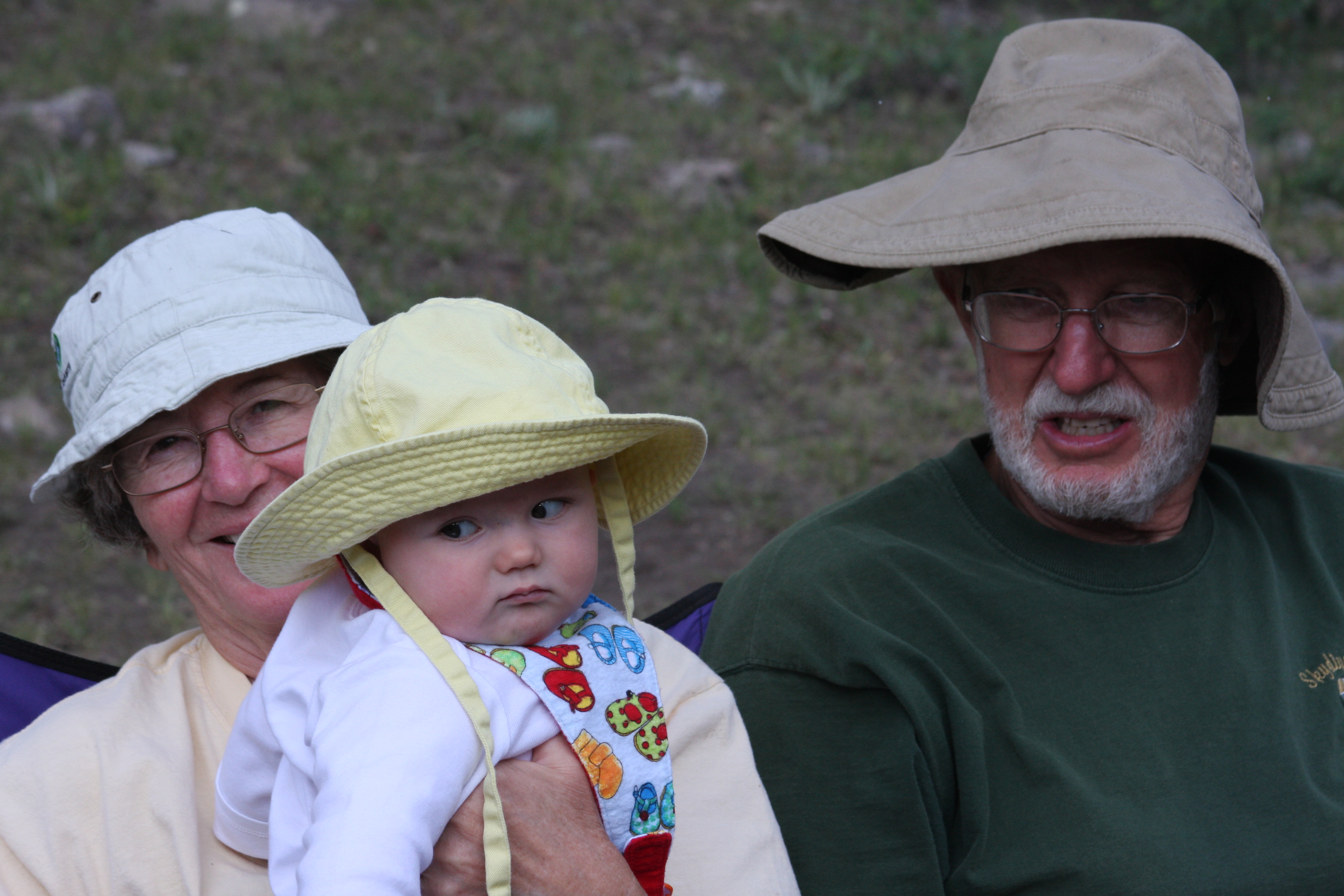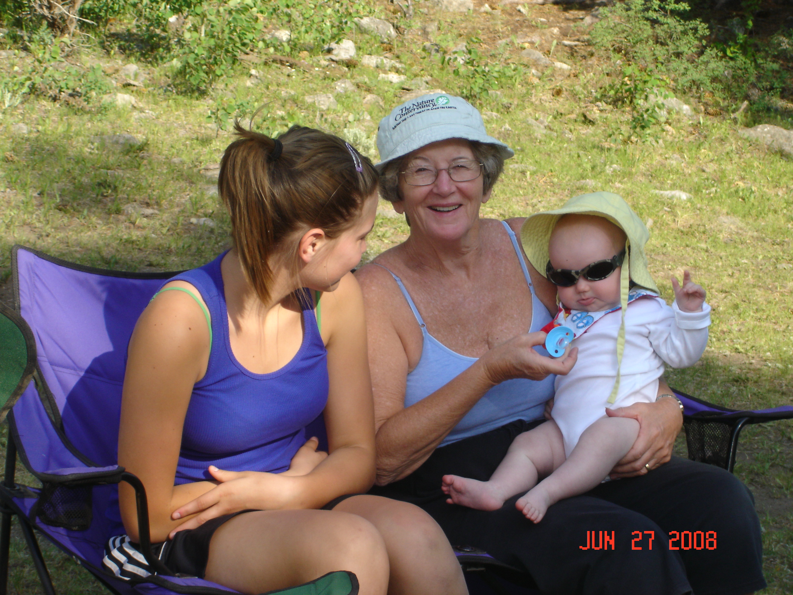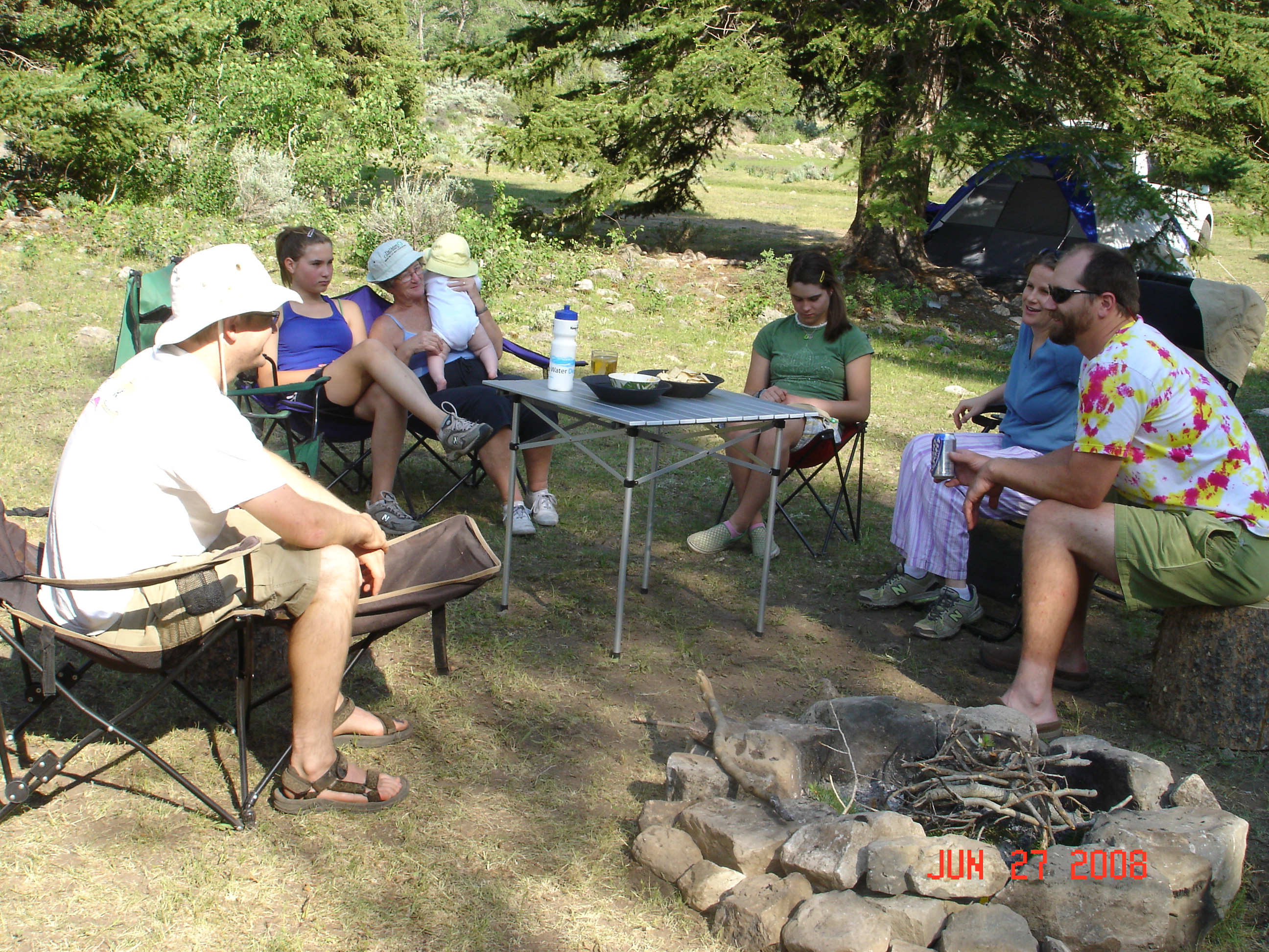 We had a 5 day campout on the North Fork of the Duchesne last week with Mike, D & D and girls, and J & A & SR. Cold at night (40 F) and hot in the day (90). We camped near the river and no one else was around, because Mom put up a big sign on the road that said "RCB Reunion". It was Steven's first camping trip, and he was well taken care of and (fairly) well behaved. He is about twenty pounds now, and a load for G & G. We have taught him to roll over, next is to teach him to crawl. Ann says to go slow! Here's the show: