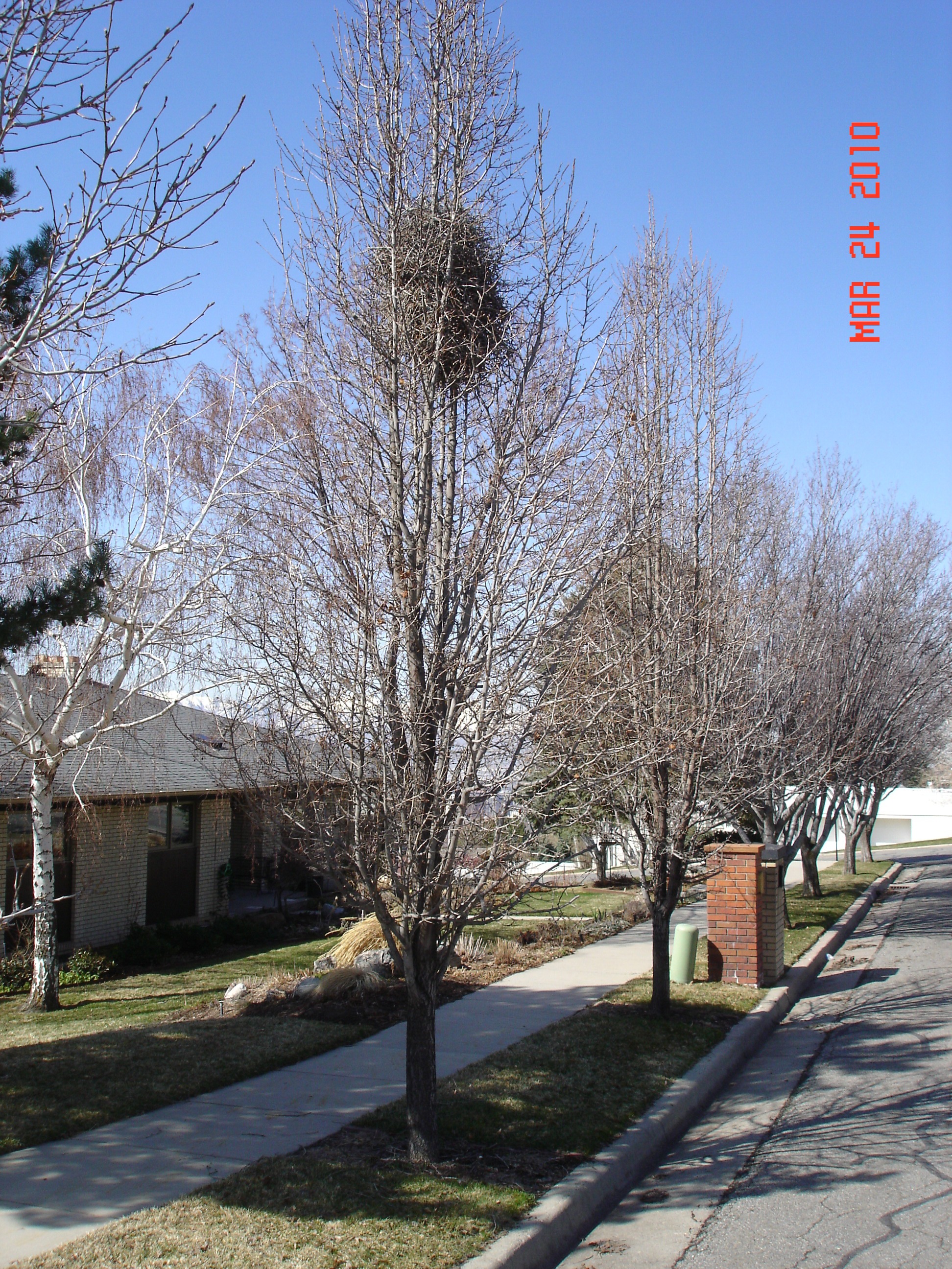 We came home from California to find a magpie nest in one of the ornamental pear trees on our verge. Must have been hundreds of sticks, brought in one at a time. We know this because they are trying to rebuild it after I took it down yesterday, again, one stick at a time. We are going out periodically to chase them away. It gets to be real messy, so we hope they will build it somewhere else.