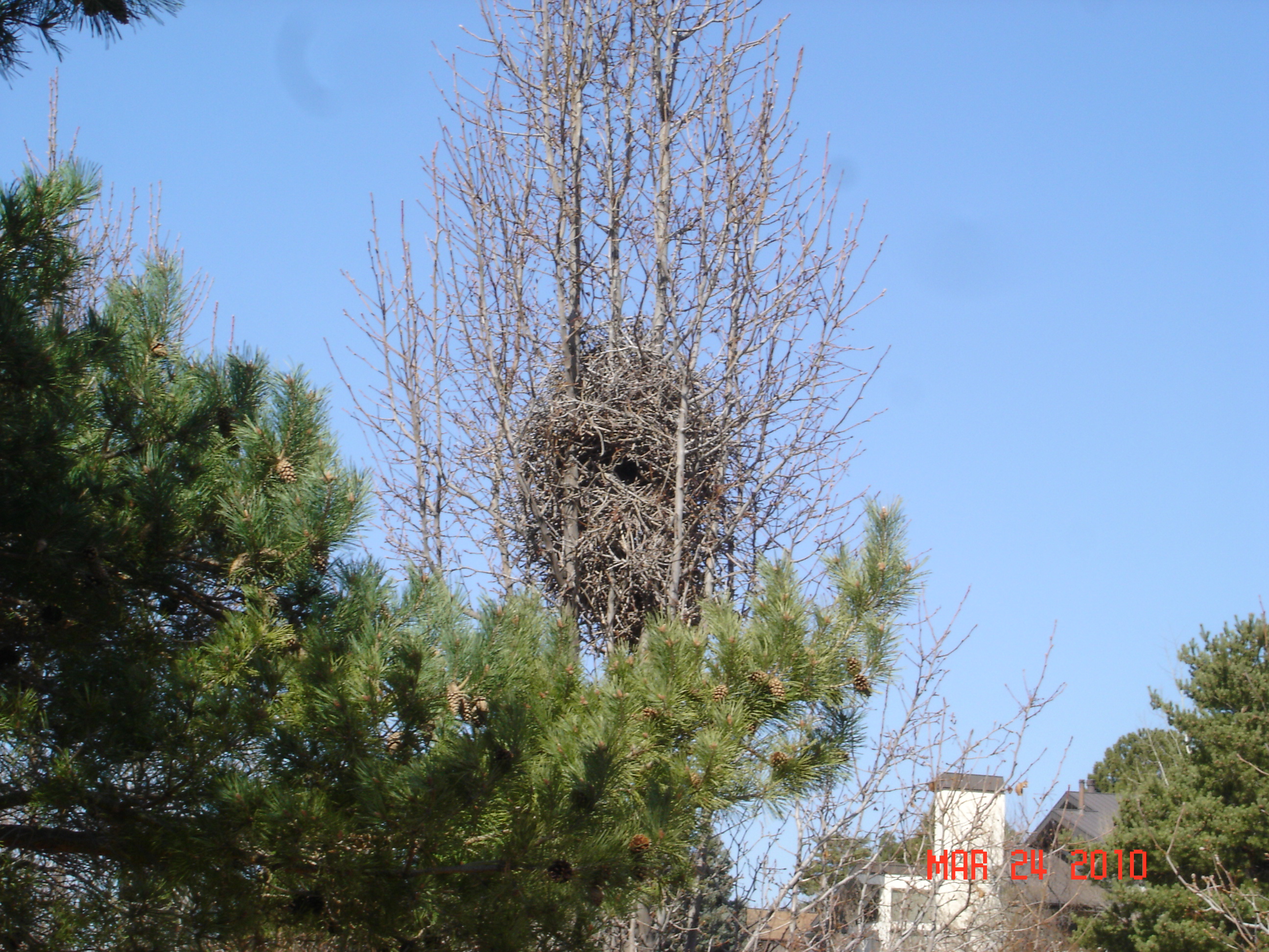 We have had them in the neighbor's tree by the garage two years ago and the nest shed sticks on the lawn for a year! Not good for the sidewalk!