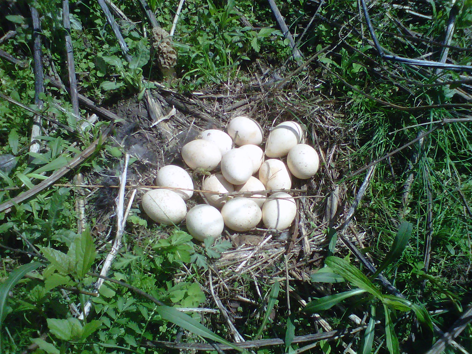 I went turkey hunting in Ohio recently and found these. The turkeys were hard to find. The only one I saw was the one I flushed off this nest that was located in a big patch of morels. If you look closely at the egg picture there is a morel next to the clutch. The morels were coming up in and around a patch of brambles merging into pasture.