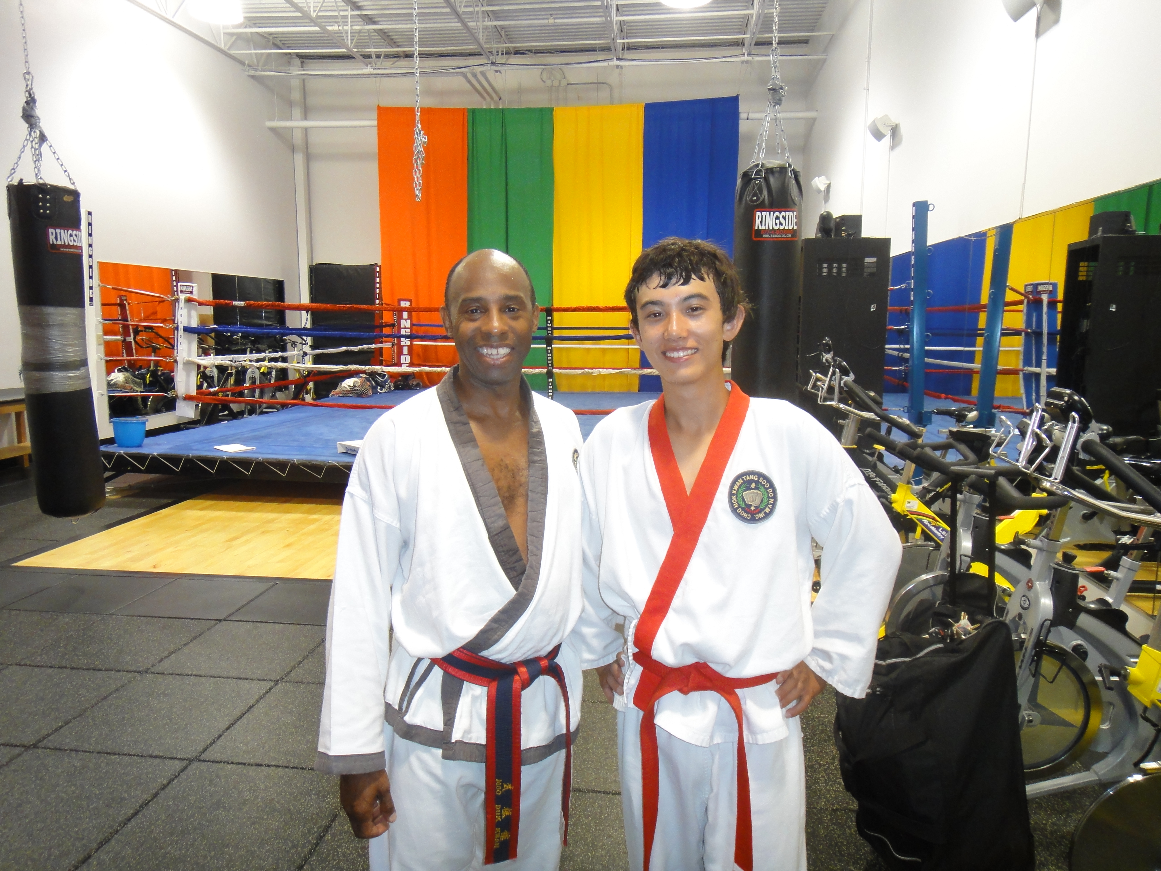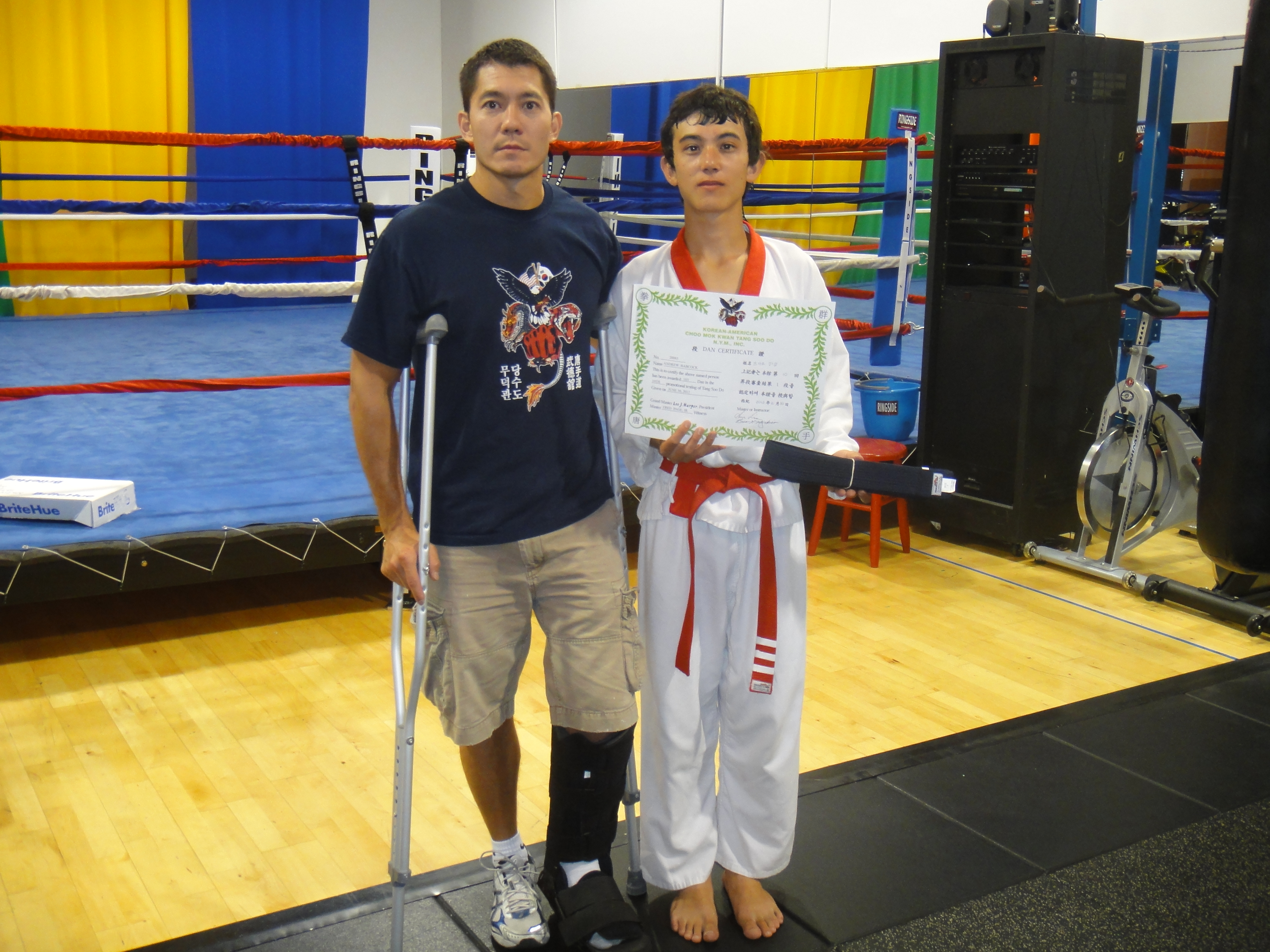 Andy tested for his black belt in June and he received his colors in July. Attached are a couple pictures from the award with Andy posing with his instructer from the weekday class (Master Sean Eichenberg) and the Saturday class (Master Brian Murkison). Sean has a boot on his foot. He broke it in two places breaking a double board doing a flying high side kick testing for his sixth degree black belt. It wasn't the foot that went through the boards. It was the foot he landed on. Master Sean in an acter too. if you get a chance, check out his karate movie, "Bound by Blood"