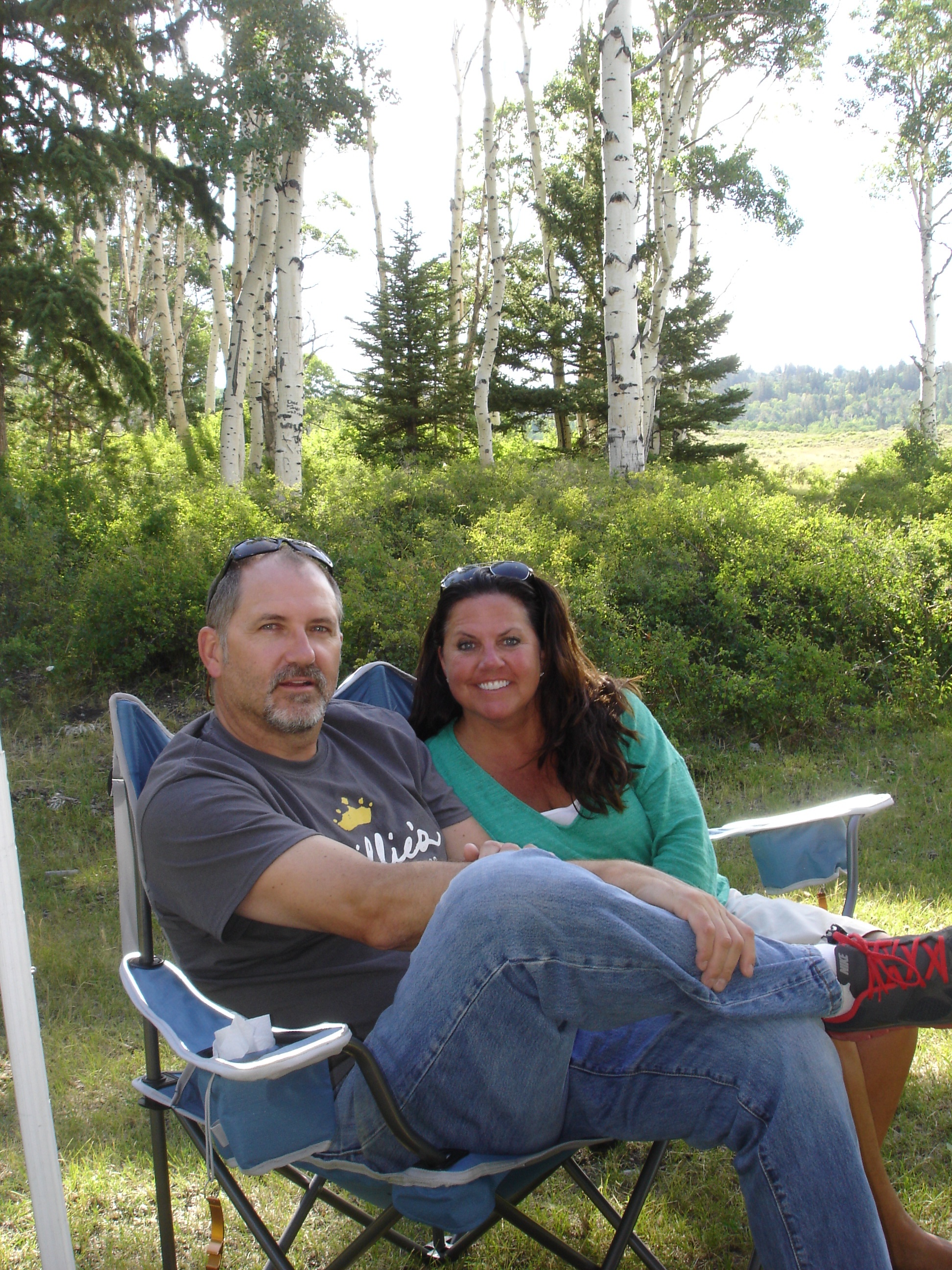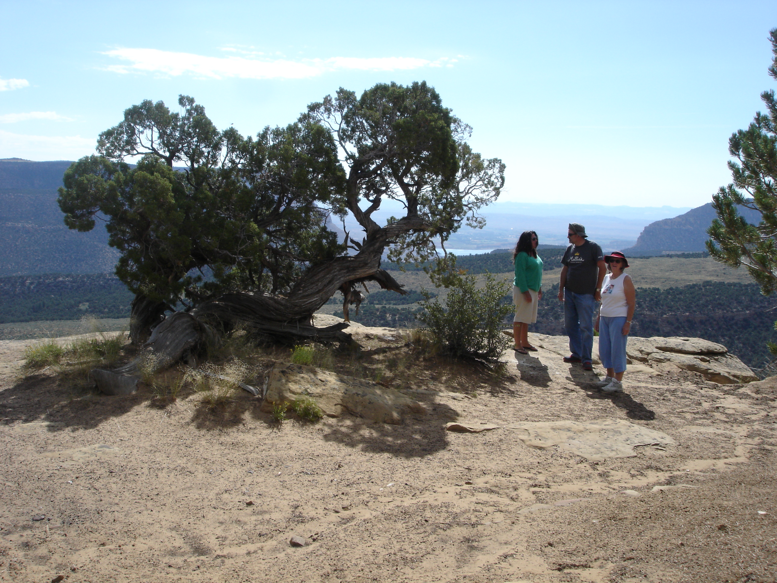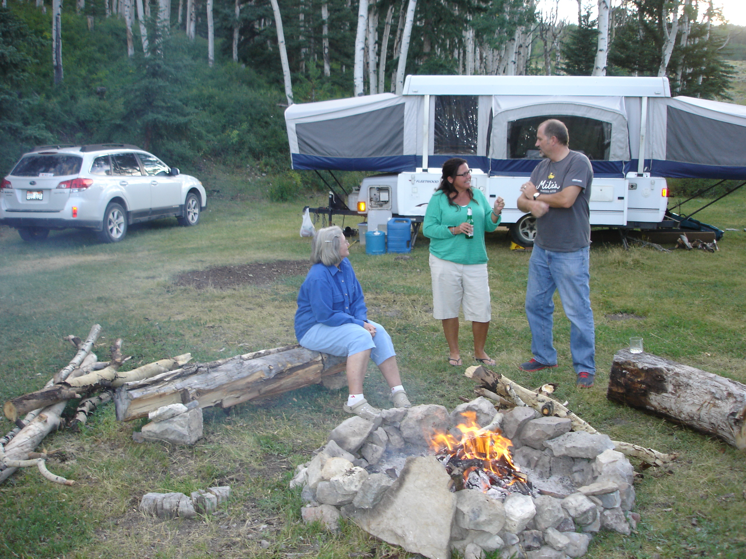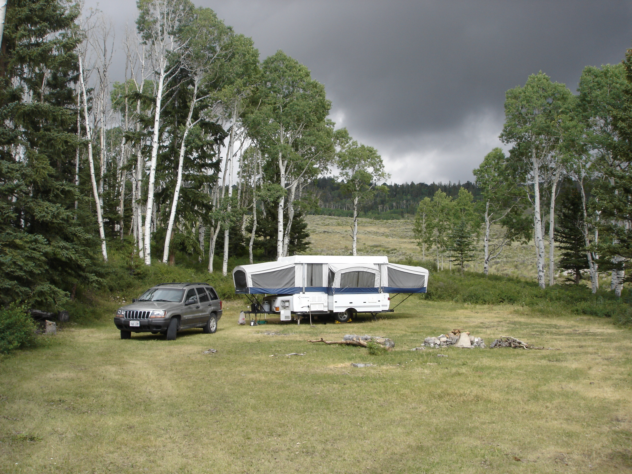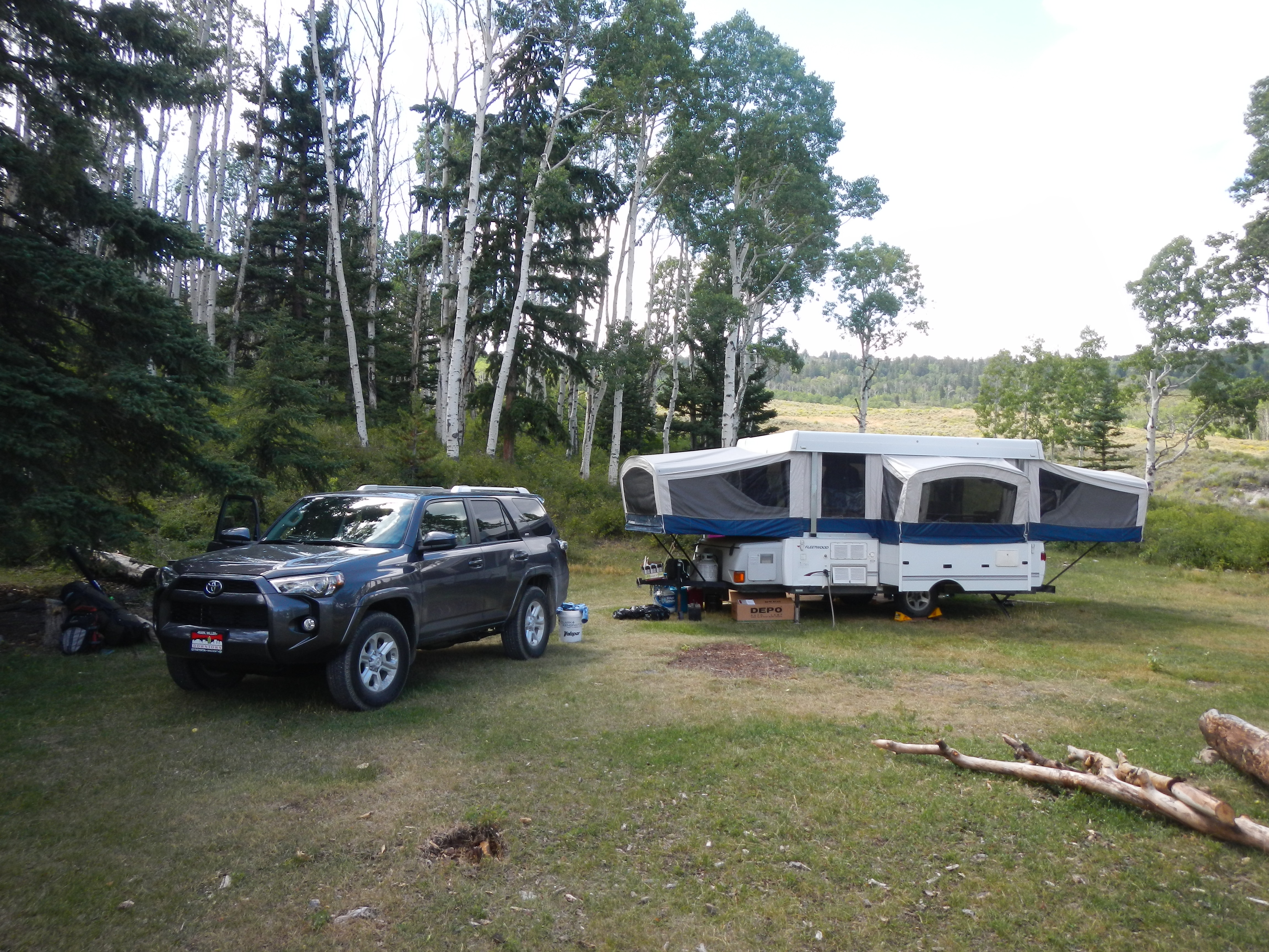 We went to our usual spot above Ferron Sunday, the 27th, It was monsoon season and lots of thunder showers. On Tuesday we thought we would go fishing and slid down the dirt access track into a tree, head on. No airbag deployed (not sure we even had them on the 2001 jeep). Judy stressed her sternum against the seat belt -I felt like I pushed the steering wheel into the dash, but didn't. We called State Farm and they hauled the jeep off to Price for estimate of damage (and maybe repair). We called David and he and Laura came down on Thursday to take us back to SLC. They stayed two nights, which was good - Dave hadn't been with us in the camper before, and Laura's Dad had a camper when they were growing up. They got out fishing and we had a great fish dinner. The Jeep has now been totaled by St. Farm, and we'll get a check for about what we could have sold it for on the street. We had been looking for a newer used one for the last month, so now we'll accelerate the search!