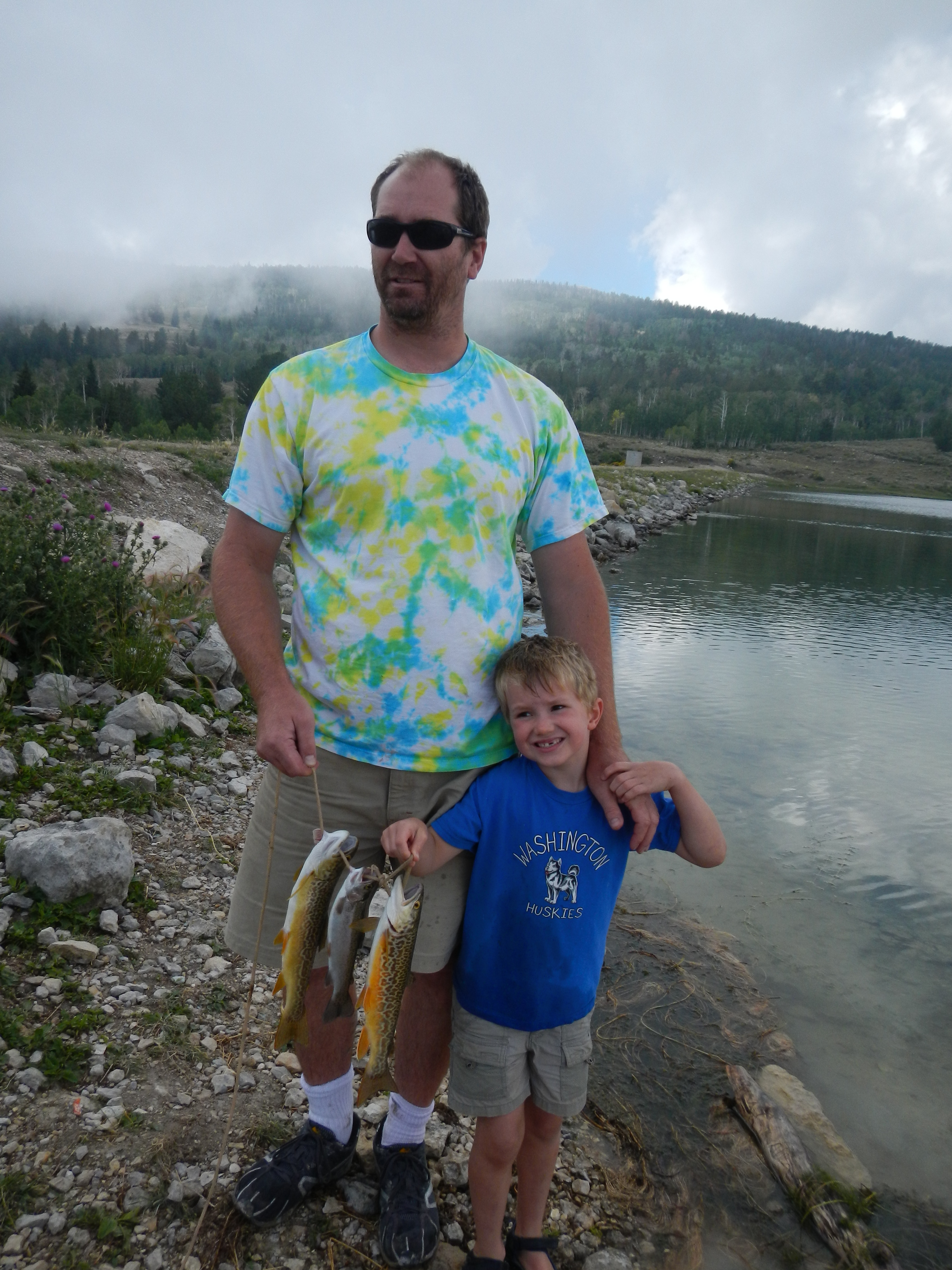 Jason and Steven with a couple of tiger trout and a nice little rainbow from Wrigley Reservoir.   Steven caught his with a reall grasshopper, which he loved catching, Jason with an artificial on fly the larger one.  Tigers a hybrid between brown and brook trout.