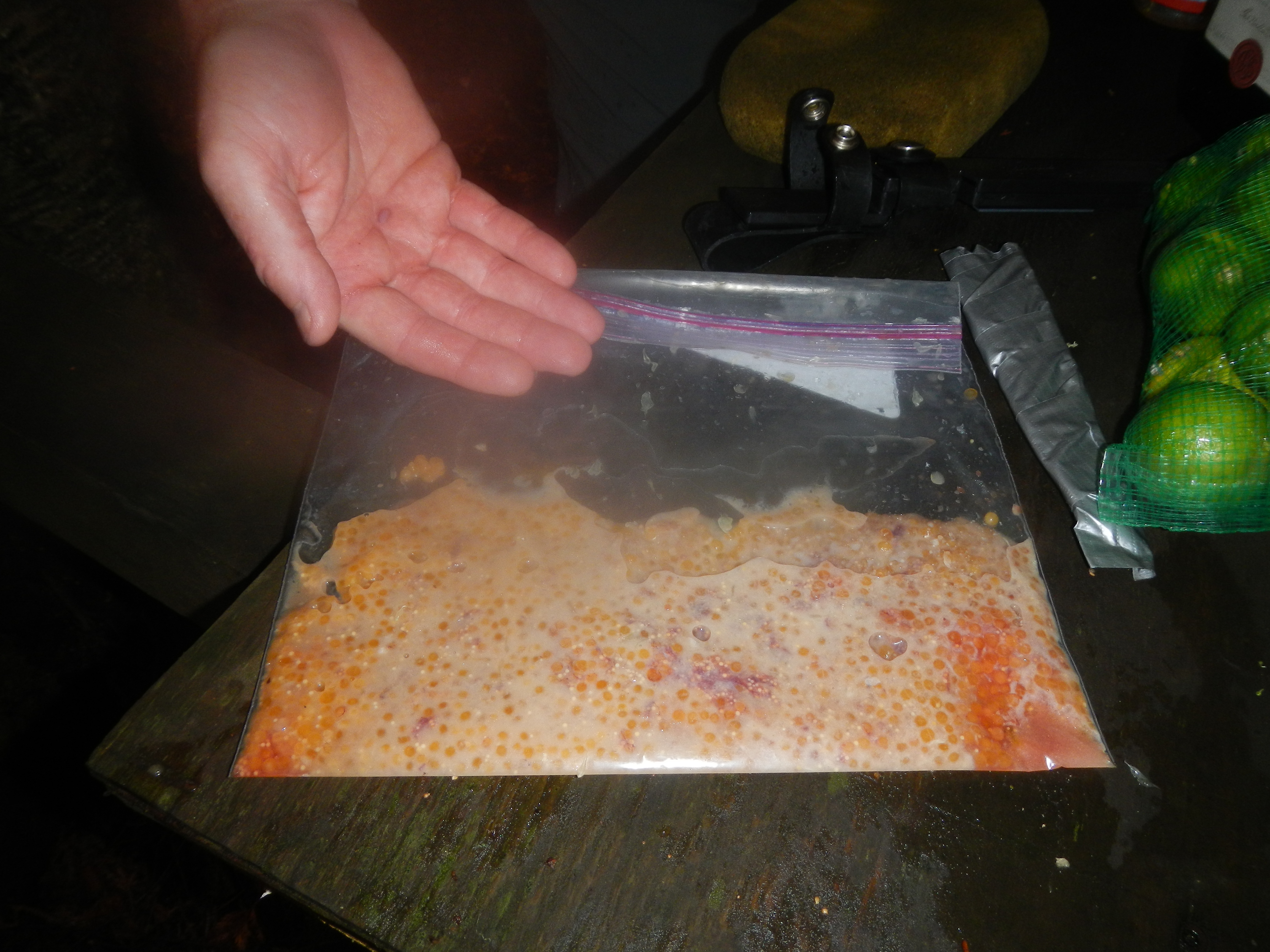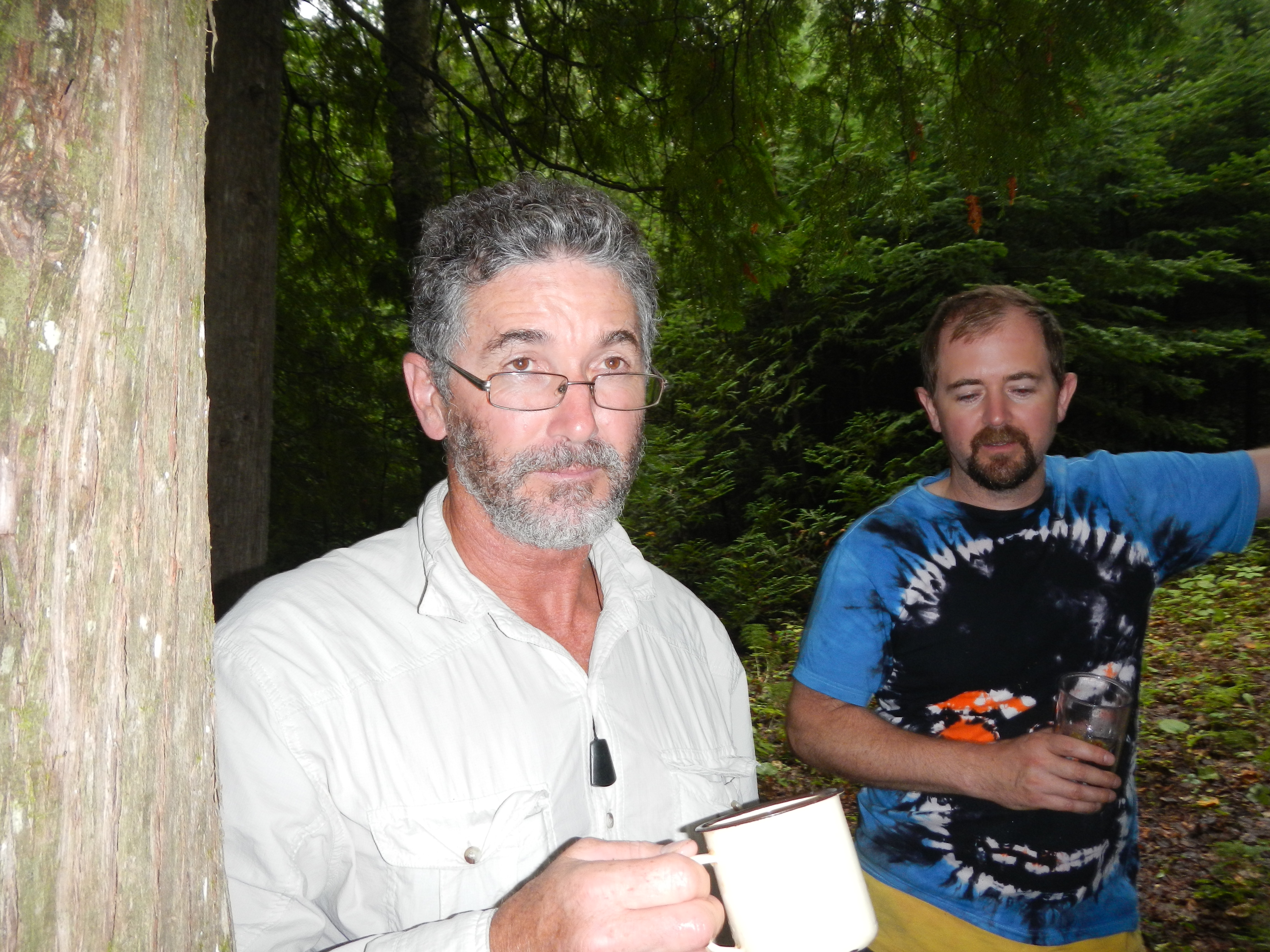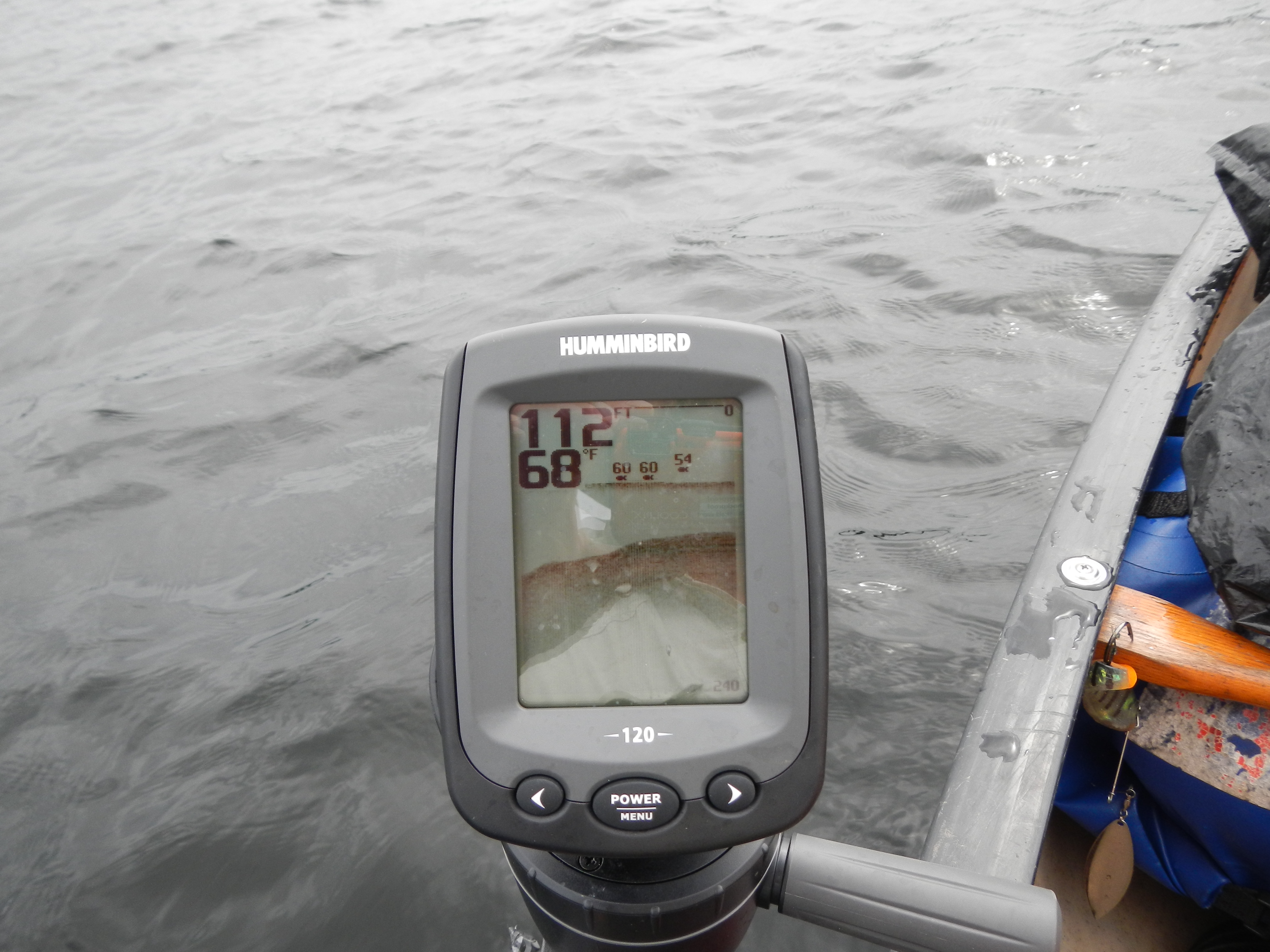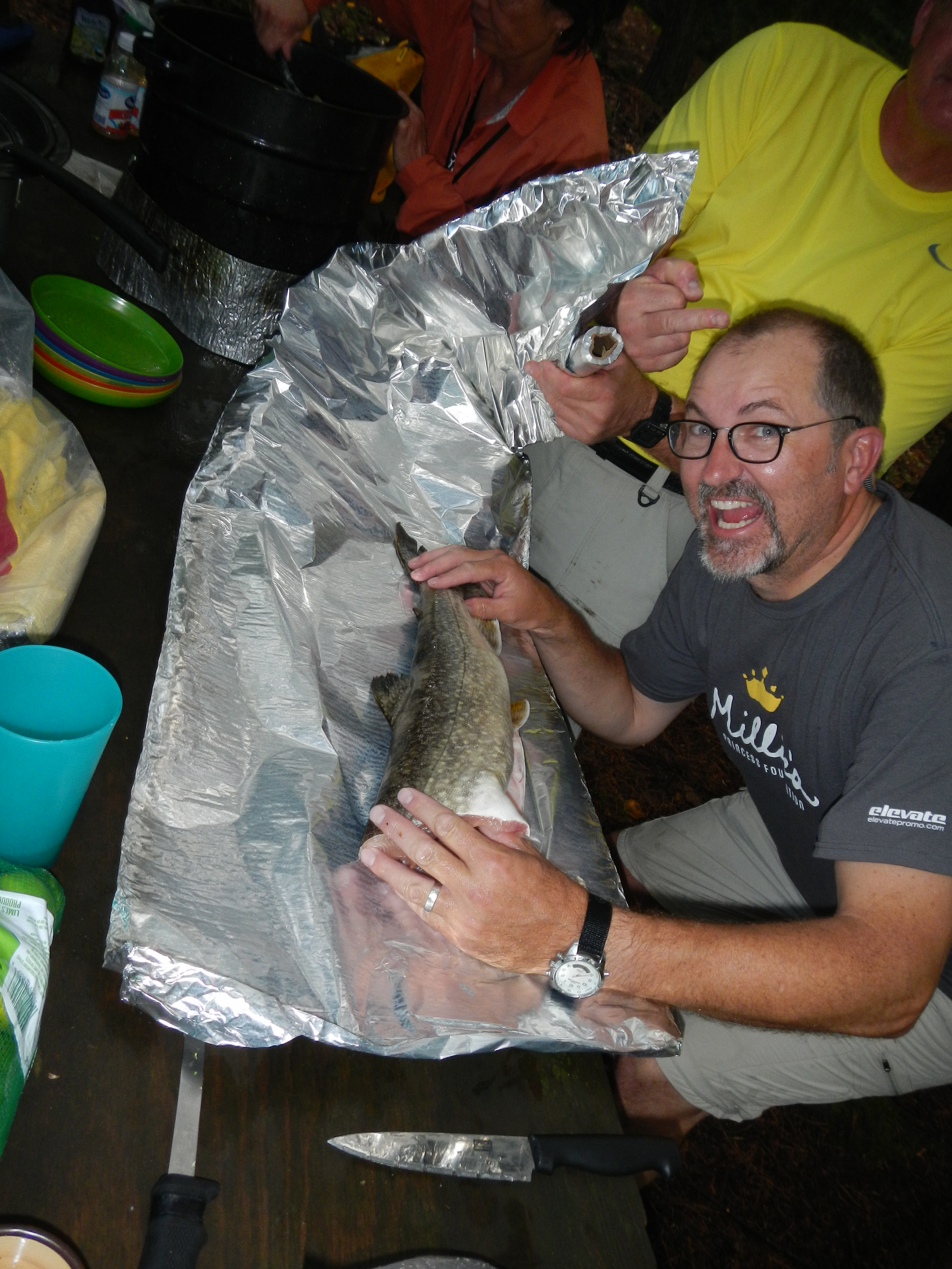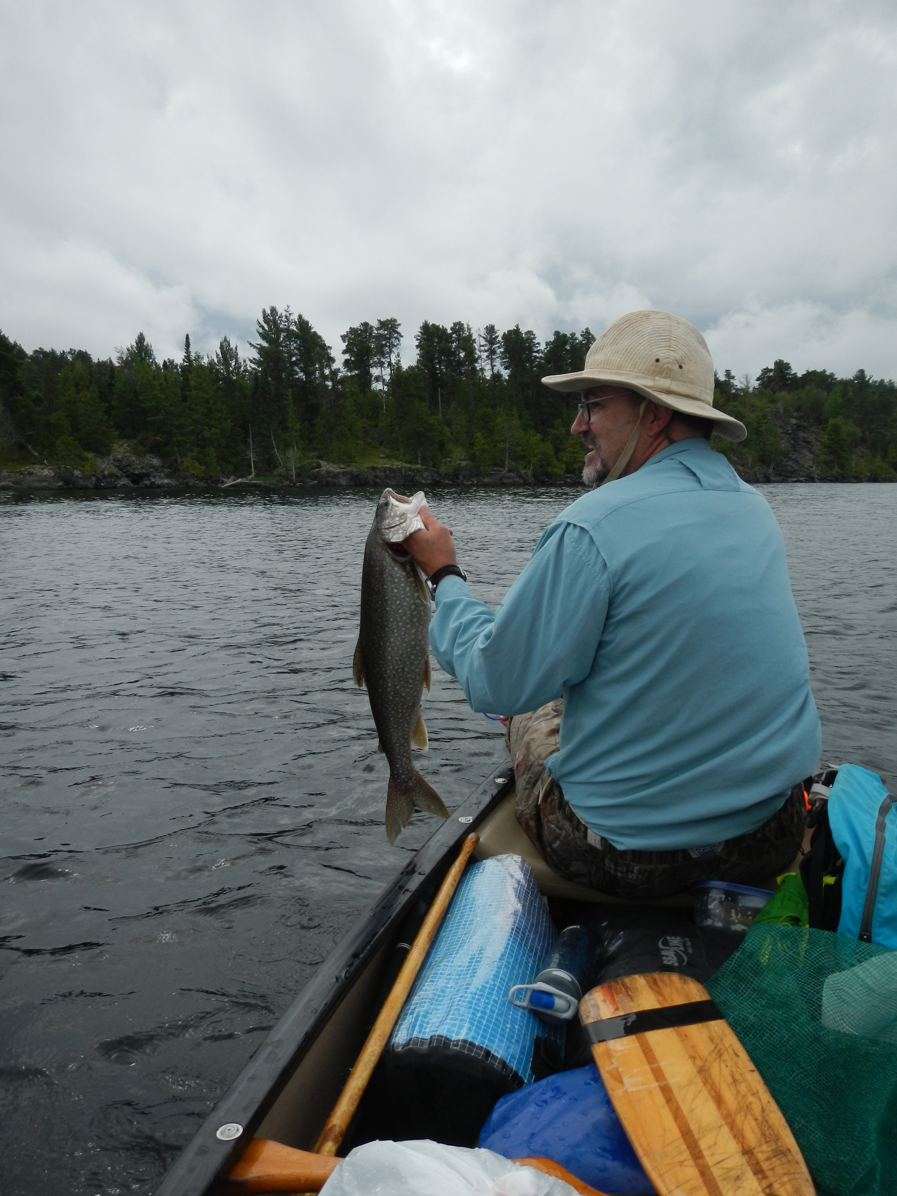 We woke up to rain, though it wasn’t heavy and things cleared up quickly, at least to a drizzle so it wasn’t really a problem. The morning was fairly leisurely and we took off about 10:30 from Caviar Lake, heading through Denmark and on to Rowan Lake. The latter is a bit of a misnomer since most people get there by paddlin’…… We certainly did; the wind was blowing its ring out all day which started out interesting and quickly became tedious. Early in the trip we had to cross a big expanse of Caviar, the wind was at our back and there were plenty of trout on the sounder so we tried a bit of jigging on the way across but without luck. Dave and I were in one canoe and Mike and Jason in the other. The other two canoes tried it briefly but then kept moving. When we got to the southern shore of Caviar we started fishing again for bass but it was pretty quiet so Mike and Jason got the paddles out pretty quickly. Dave and I were about to do the same but saw some fish on the bottom and thought we’d quickly get the jigs out. Of course Dave managed to hook another trout which he duly landed, it was a 29 incher, about 5 ½ lbs. A little lumo paddle tail plastic jig did the trick this time. It was sunny and warm there and everyone else was way ahead of us, so we started trying to catch up. We couldn’t see anyone ahead and the conditions were deteriorating but we knew where we were supposed to meet for lunch and we started racing the storm clouds. We were getting close to the rendezvous point but couldn’t beat the storm, nor could we find the brothers as they didn’t seem to be anywhere on the island we thought we were supposed to be at. After paddling around it a couple of times we were totally soaked and had decided the crew had paddled on further, which turned out to be the case. They were all waiting about 15 min up the lake under a nice big blue tarp they had had time to set up, and flashing their lights so we would see them. We got the trout but had to pay the price. Well, I paid the price anyway, Dave was still smiling so I think he could care less about how wet he was! Can’t remember what we had for lunch but it included beer which tasted pretty good by then.