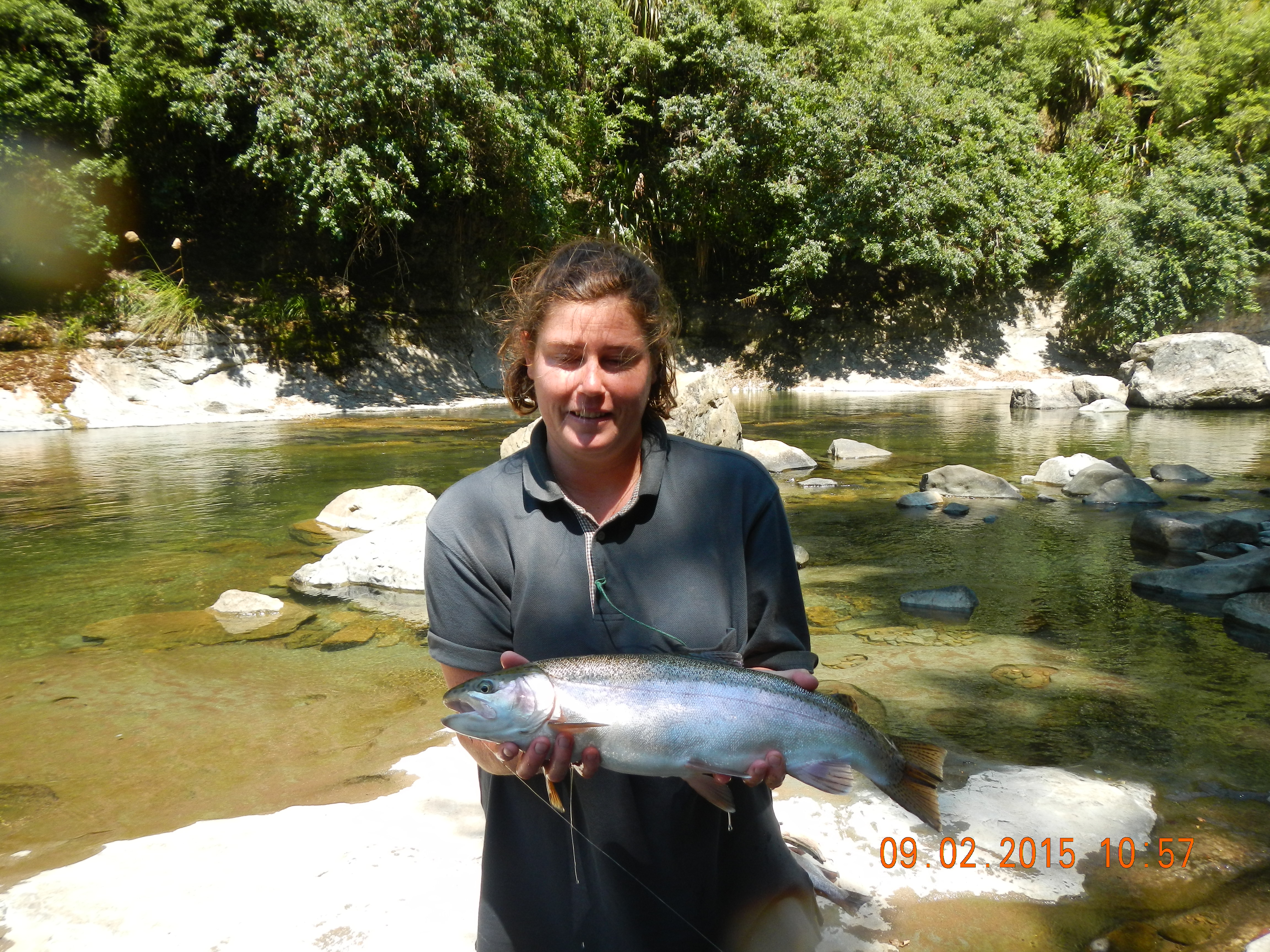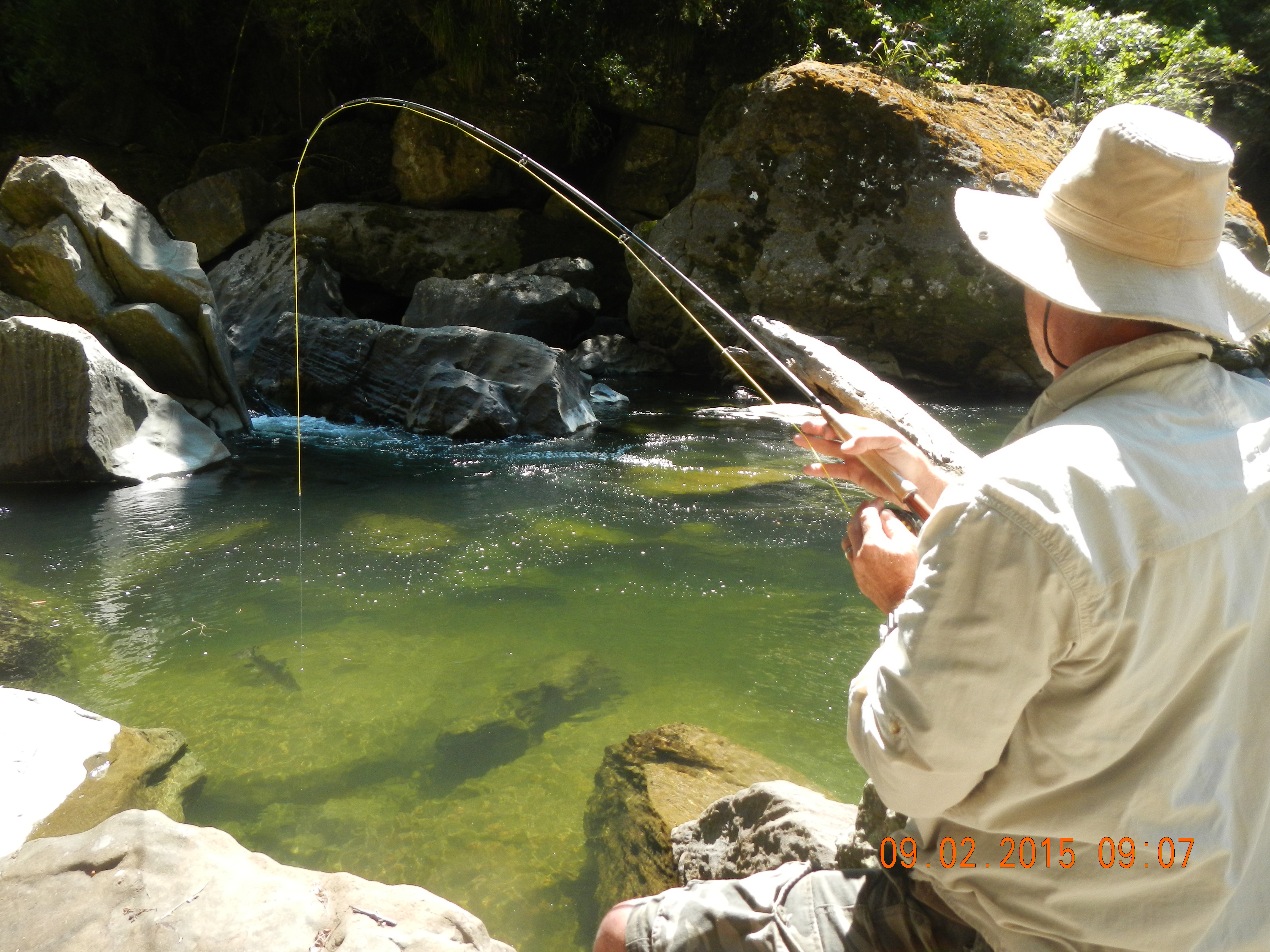 The river was amazing with the sides of the banks like walls and at the southern end a massive waterfall. We fished all kinds of fly’s till we found the golden ticket and then we were on we were spotting the rainbow in the water and casting out. An eel was attacking dads trout while he was bringing it in we have it on video ill try up load it.